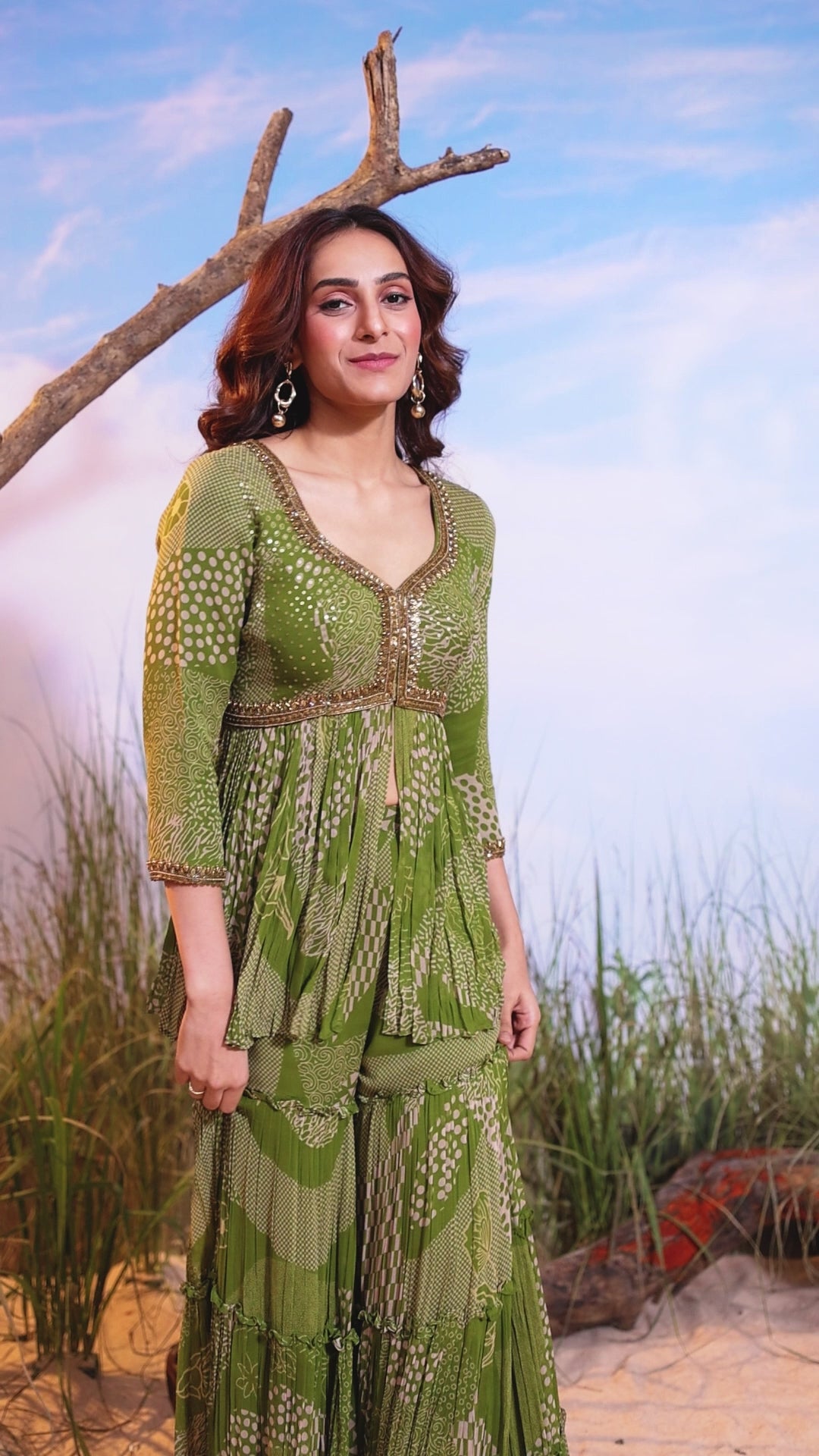 Step out in this vibrant two-piece ensemble that fuses traditional print with a contemporary silhouette. The set features a fitted Peplum Kurta with a flattering V-neckline and intricate hand-embellishment at the waist, paired with a voluminous Tiered Sharara, all showcasing a beautiful, dynamic print.