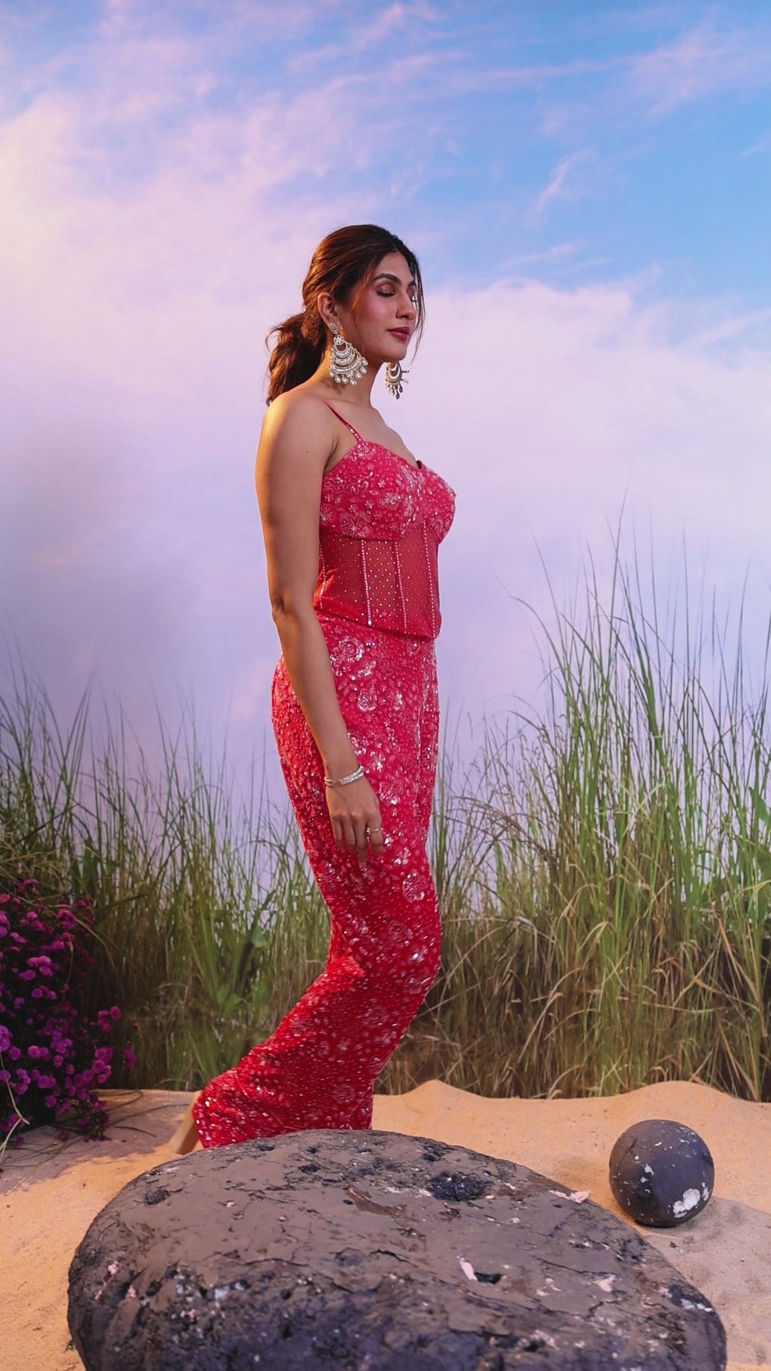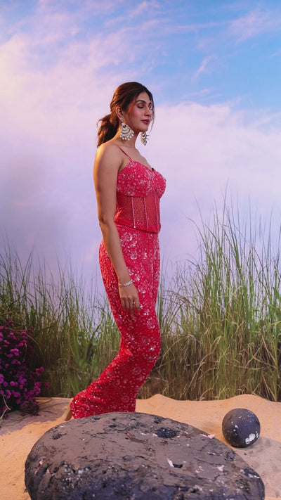 This is a vibrant and glamorous georgette silk co-ord set, featuring an embellished corset top and bootcut pants in a striking ombre coral-to-red shade, luxuriously detailed with all-over sequins, beads, and cut dana work. This elegant set is perfect for festive occasions, wedding functions or evening celebrations.