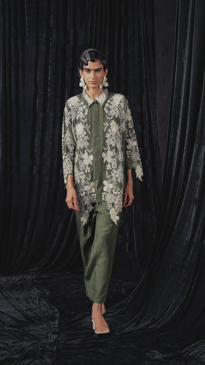 Exude effortless sophistication in this stunning Olive Green Raw Silk Co-Ord Set. The ensemble features an elegant collared top, richly embroidered with detailed floral threadwork, and a pair of perfectly matched pants, making it a stylish choice for any festive occasion.