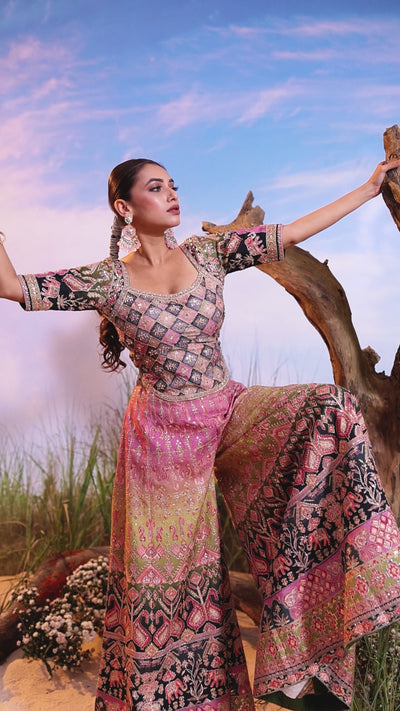 This spectacular two-piece ensemble is perfect for a statement festive look, showcasing a gorgeous color transition and intricate hand-embellishment. It features a fitted Crop Top Blouse with a low scoop back, paired with a voluminous Wide-Legged Palazzo, both in luxurious Premium Silk.