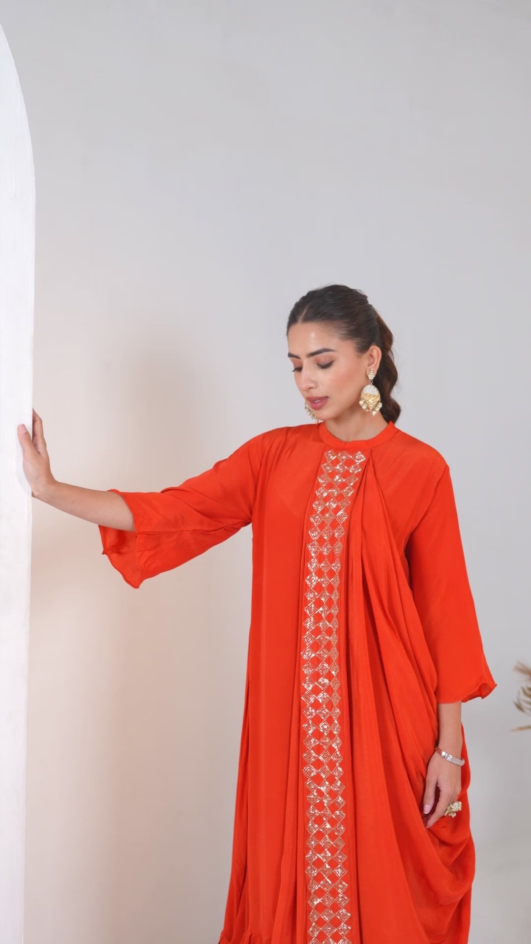 Upgrade your wardrobe with the Orange Embellished Premium Silk Gown. Its elegant drape and intricate cut dana handwork make it perfect for any semi-formal occasion. Made with premium silk, this gown is sure to impress with its luxurious look and feel. Elevate your style with this stunning piece.