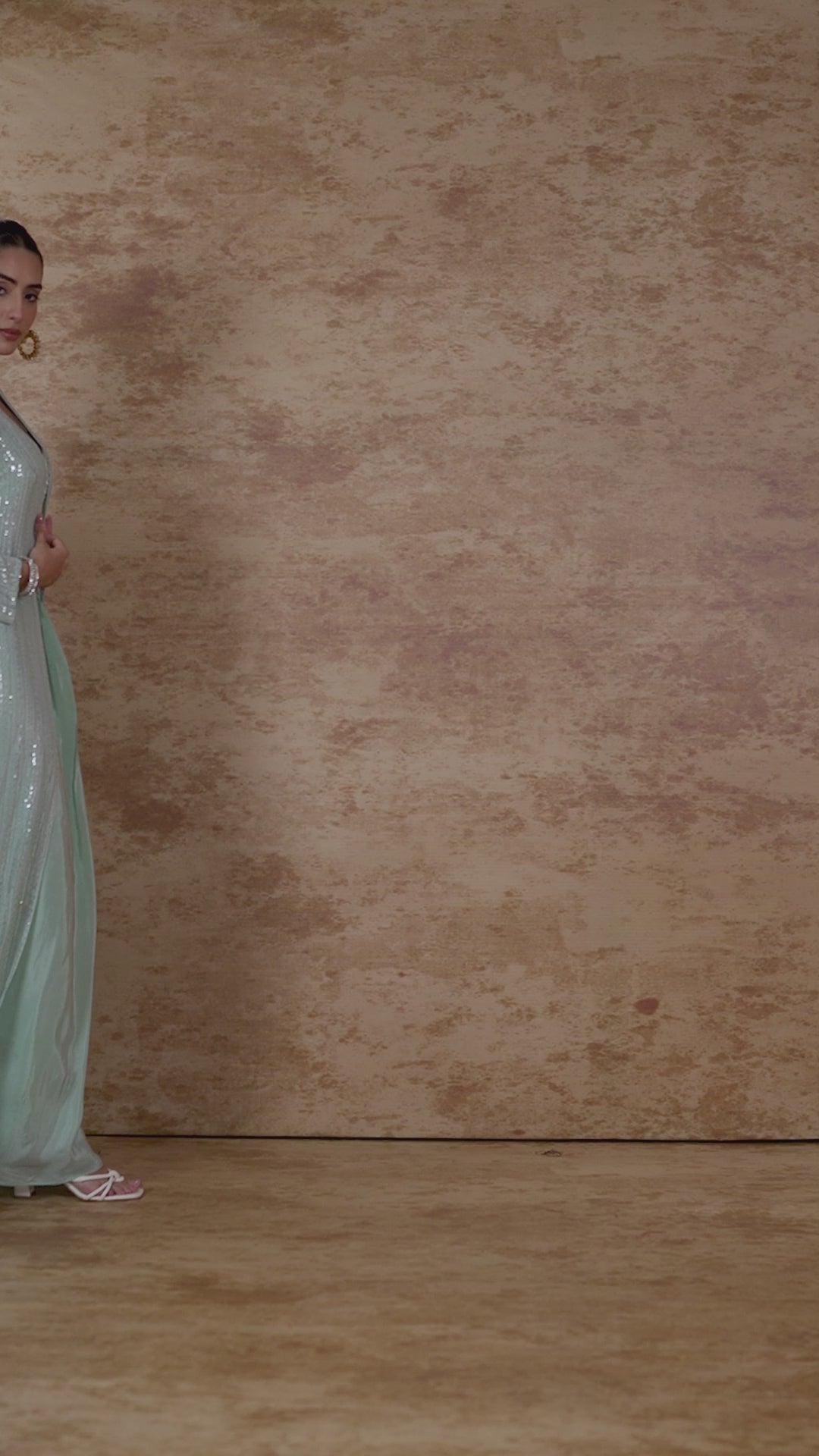 Introducing our Pale Teal Embellished Georgette Silk Shrug Set, a perfect blend of elegance and style. This exquisite ensemble features a beautifully crafted shrug adorned with intricate sequin, bead, cut dana, and zari handwork. It’s paired with a matching padded crop top and a solid premium crepe silk draped skirt, making it an ideal choice for semi-formal occasions.