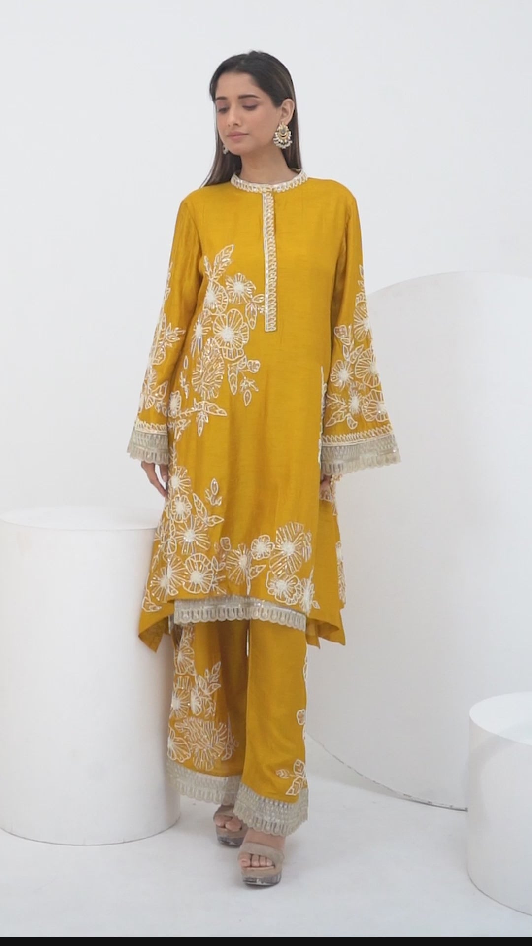Deep yellow embellished Chinon silk co-Ord set, featuring detailed cut dana, thread, stone and sequins handwork. The top is styled with elegant flared sleeves and paired with matching palazzo pants. Perfect for parties and Haldi functions, this ensemble offers a radiant and festive look with traditional flair.
