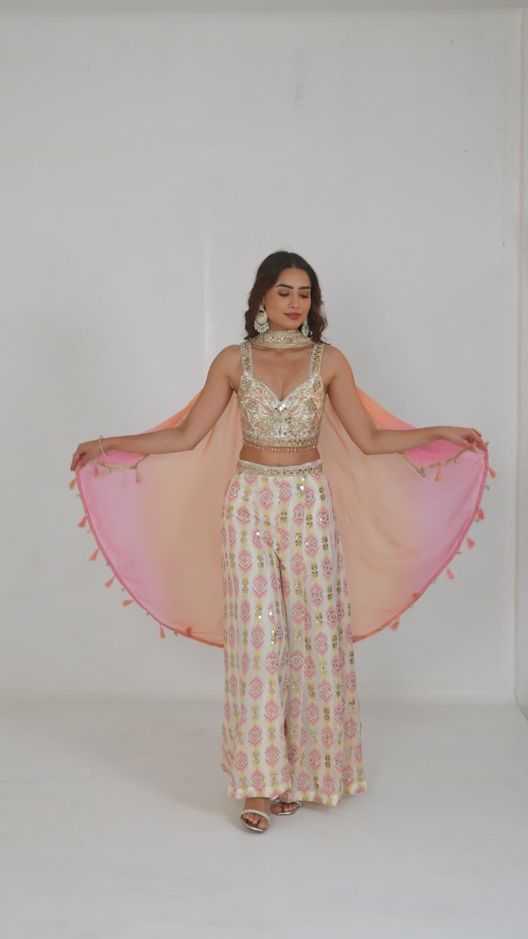 Upgrade your semi formal look with our Pastel Cream Embroidered Georgette Silk Palazzo Set. The padded crop top features stunning stone and mirror handwork, while the matching palazzo and dupatta completes the luxurious look. Indulge in elegance and stand out in any event.