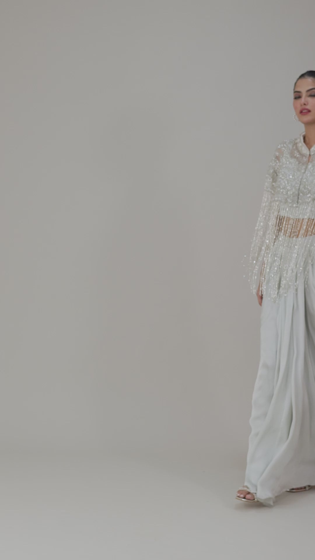 Introducing the Pastel Grey Embellished Satin Silk Skirt Set— a chic semi-formal ensemble. The set features a pleated satin silk crop top, paired with a heavy embroidered net cape adorned with intricate bead and cut dana handwork. The look is completed with a matching pleated satin silk skirt, offering an elegant and refined silhouette. Perfect for special occasions where sophistication meets style.