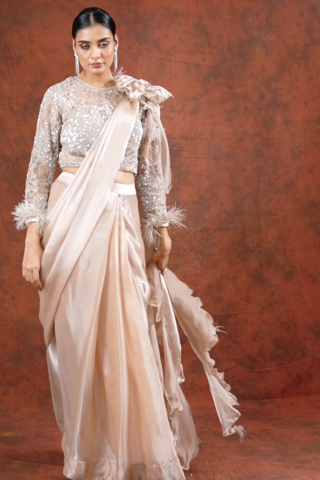 Pastel peach glass organza silk draped ruffles saree with minimal sequin embellished border. Teamed with matching heavy sequin embroidered sheer blouse. Apt for semi formal wear.