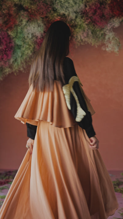 A flowy, Peach asymmetric gown paired with black georgette silk flared sleeves and intricate embellishments.