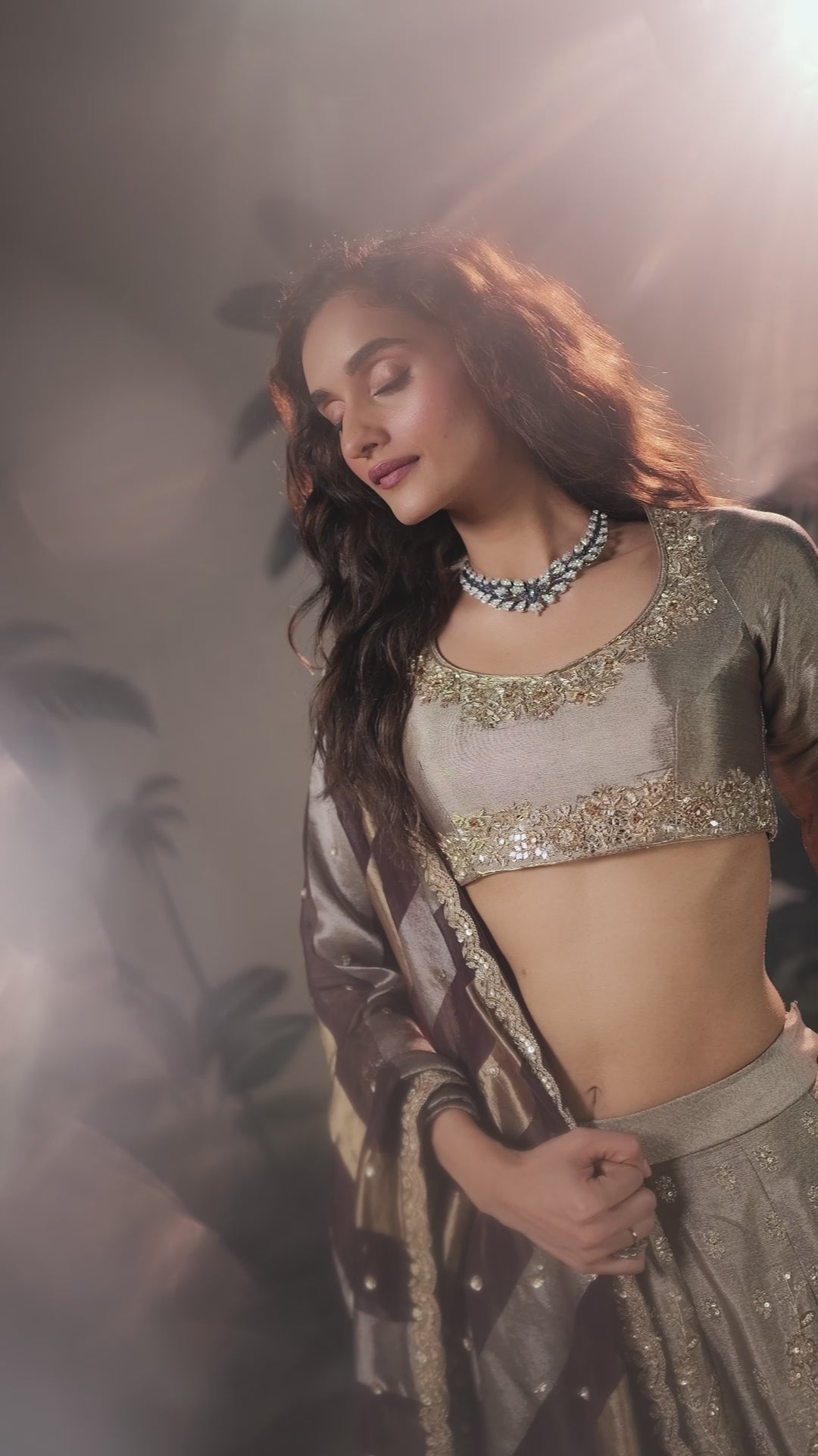 Step into refined grandeur with this Taupe Gold Embellished Premium Silk Lehenga Set.
