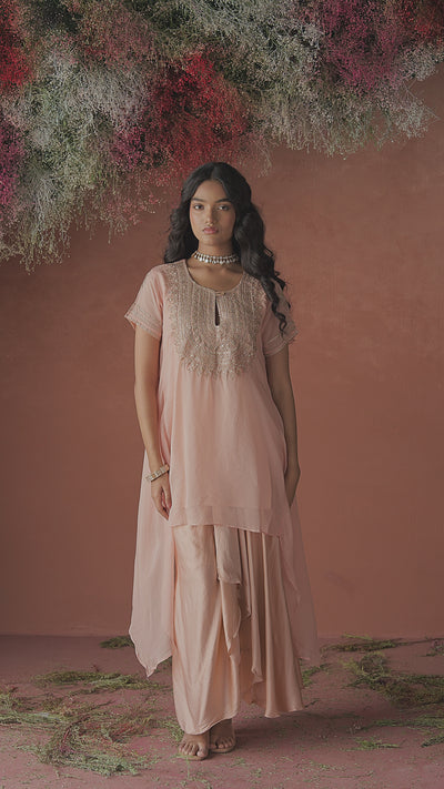 Radiate fresh, vibrant energy in this striking Light Peach Pink Set. This two-piece ensemble features a short, sheer organza silk kurta with an intricately hand-embellished yoke adorned with sequins, golden thread, and beads. It is perfectly paired with a beautifully draped satin silk skirt, creating an elegant fusion of flowing textures.