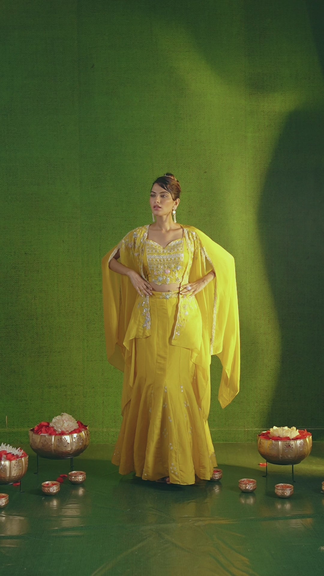 Introducing our Pear Green Chinon Silk Skirt Set: a satin silk crop top and cape is adorned with intricate sequin, zari, and thread handwork. Paired with a matching solid pleated skirt, embellished at the waist, this set is perfect for semi-formal events.
