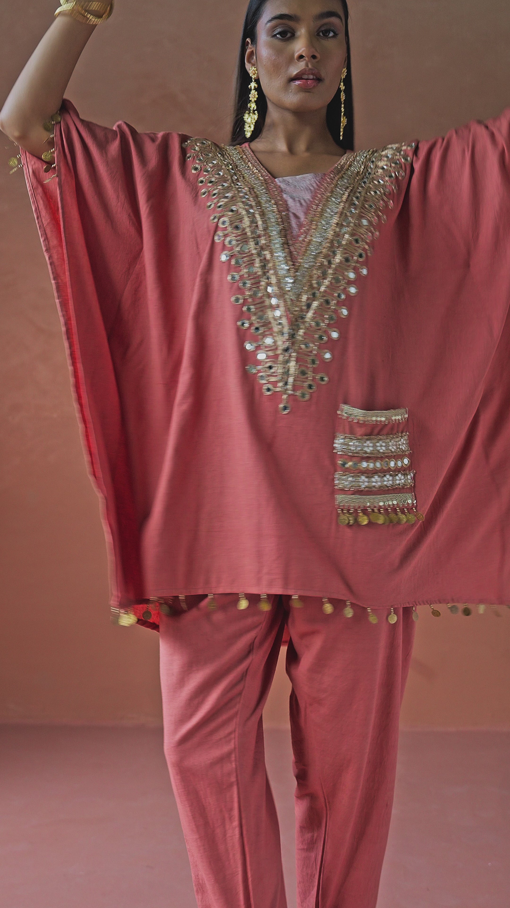 Soft Peach Embellished Organic Cotton Kaftan Set