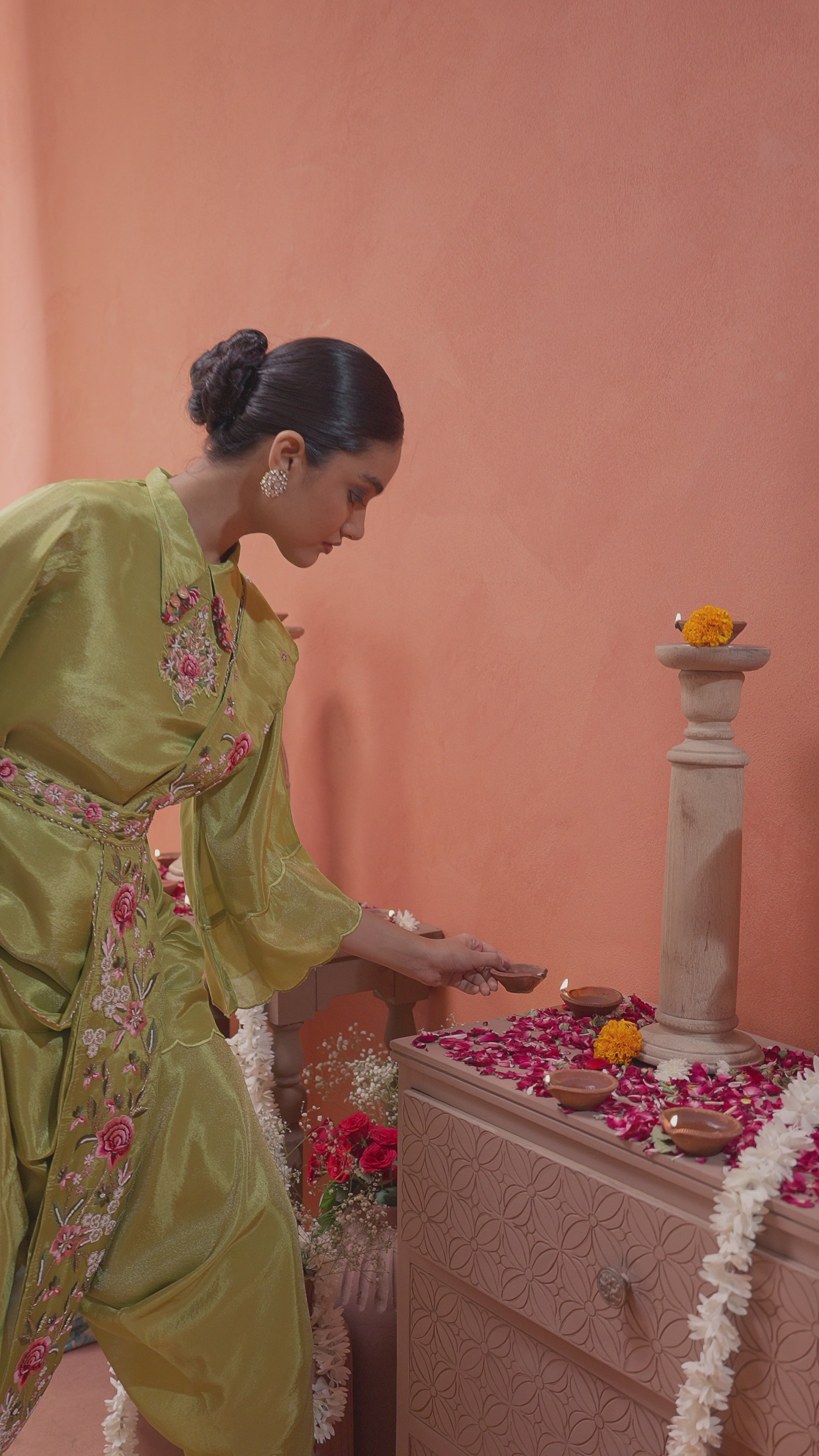 Lime Green Embellished Shimmer Tissue Silk Tunic Set