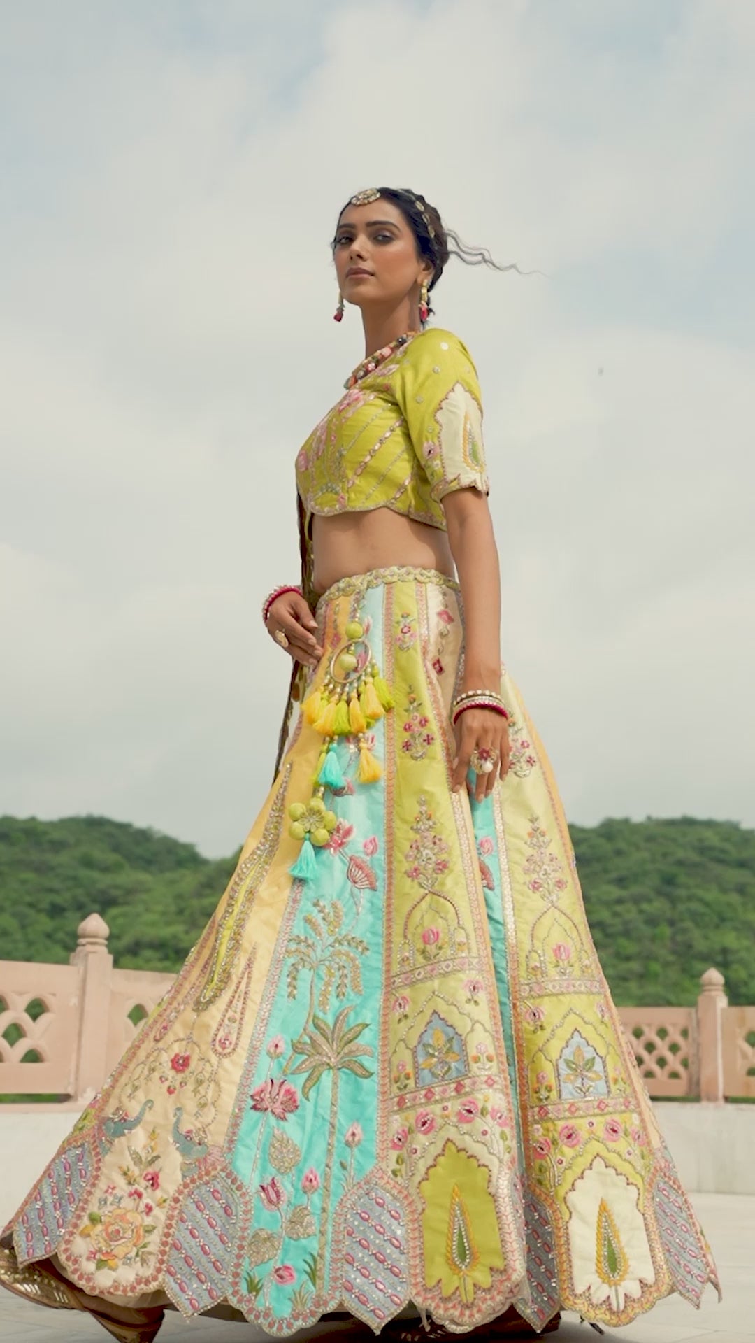 This traditional and elegant pear green lehenga set is made with premium silk fabric and features intricate embroidered and hand work details. The lehenga has a flare of 4.5 meters. The set also includes a blouse and a net dupatta for a complete and sophisticated look. Perfect for special occasions like engagement, festival, sangeet, and wedding.