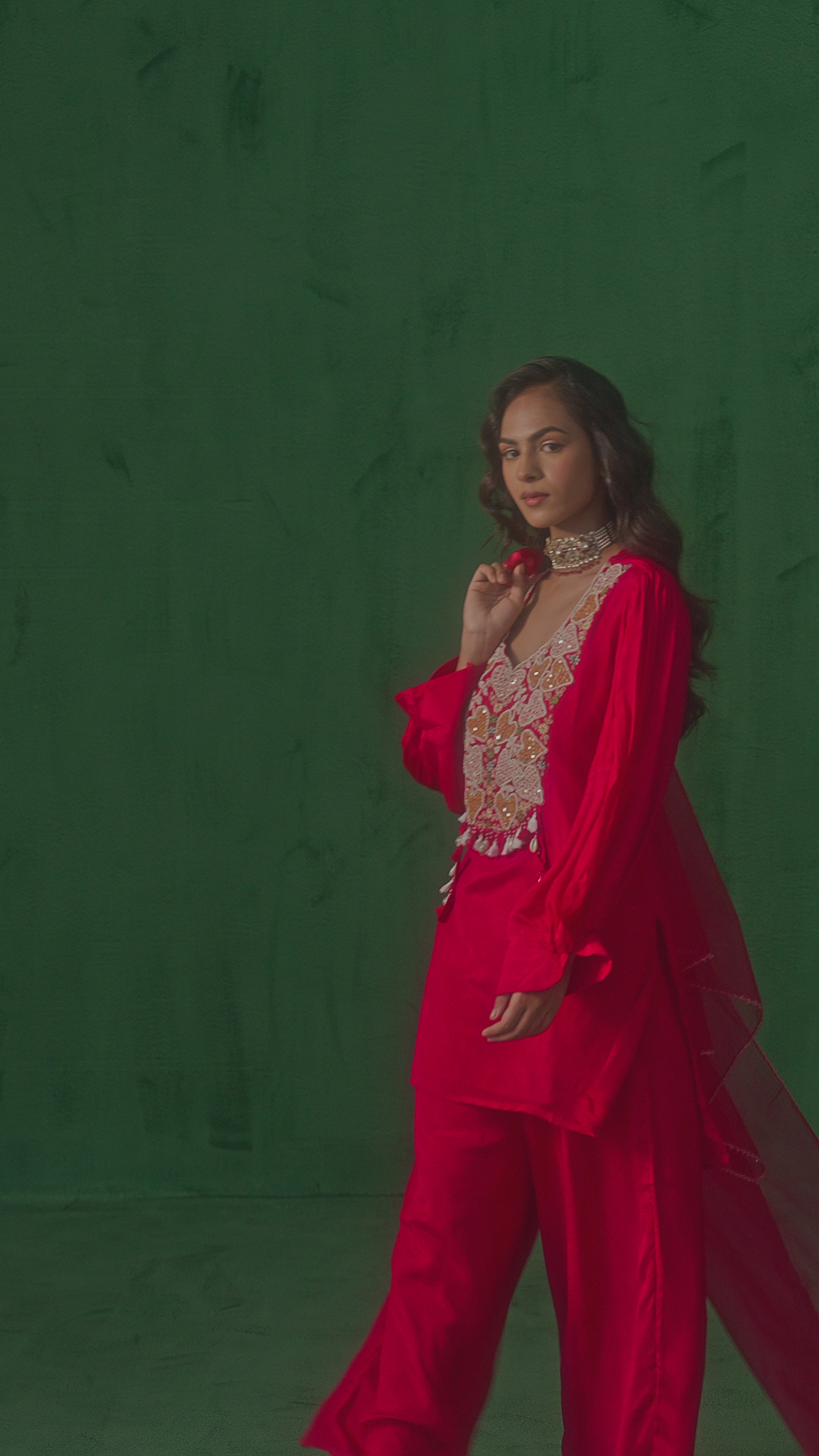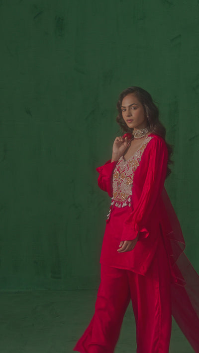 Dark Pink embellished Kurta paired with Chinon Silk Palazzo and Dupatta.