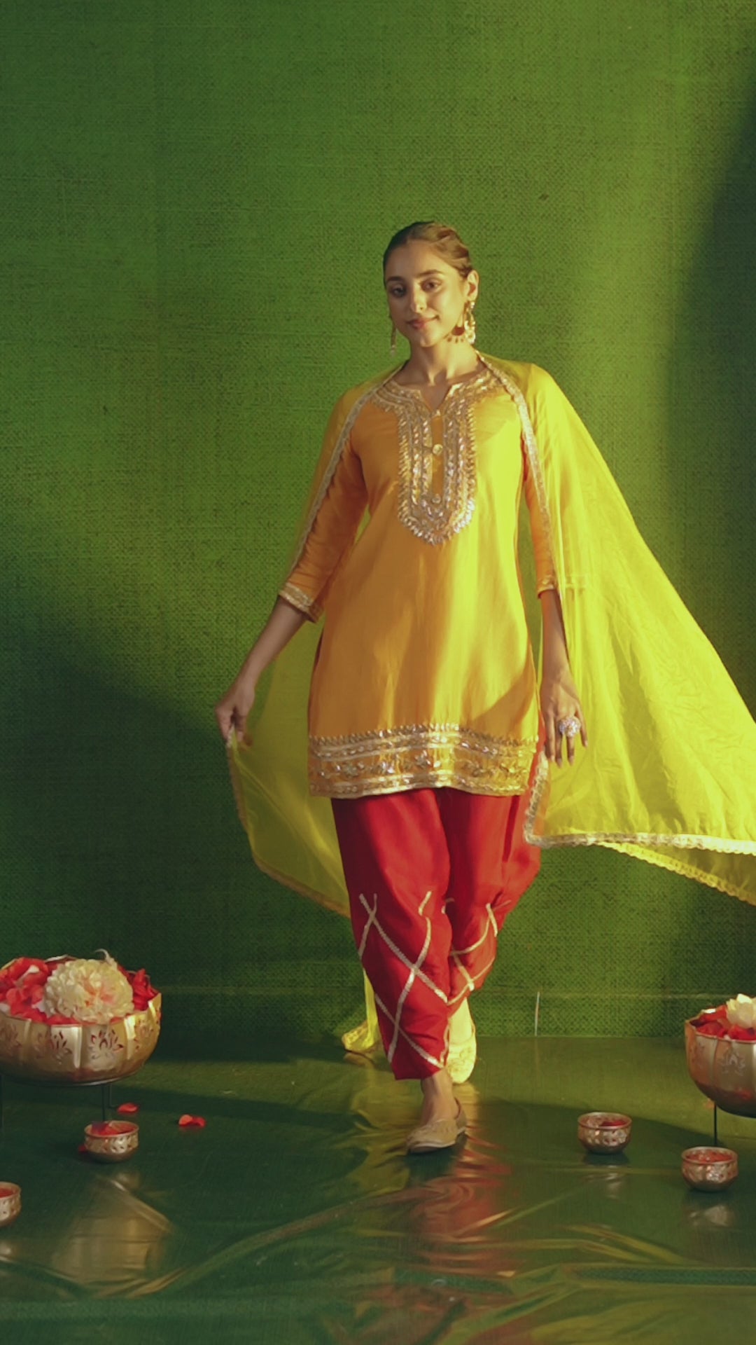 Step into elegance with our stunning Festive Yellow Embellished Raw Silk Salwar Set. The kurta is adorned with intricate work of golden gottapatti around neckline and edges. Complemented by red raw silk salwar with work on bottom and paired with green organza dupatta with lace work on border. Perfect for semi-formal wear.