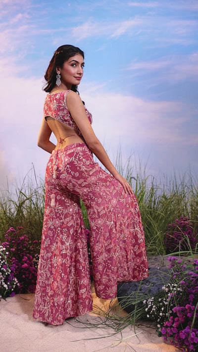 This vibrant two-piece set is perfect for a stylish festive or resort look. It features a sleeveless Crop Top with a modest neckline and a daring open back, paired with voluminous, flowing Wide-Legged Palazzo pants, both crafted from fluid Chinon Silk and richly decorated with print and handwork.