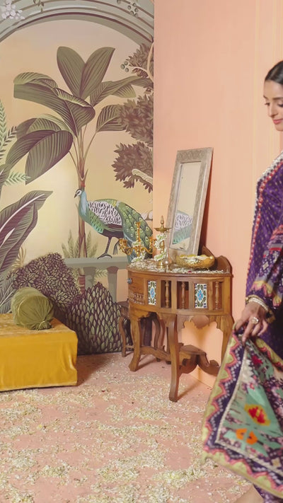 A rich Plum Purple Muslin Crepe Silk Kurta Set featuring a flowing straight kurta adorned with traditional print and meticulously embellished with mirror, bead, and zari handwork. The set is completed by a voluminous Afghani pant and a coordinating dupatta.