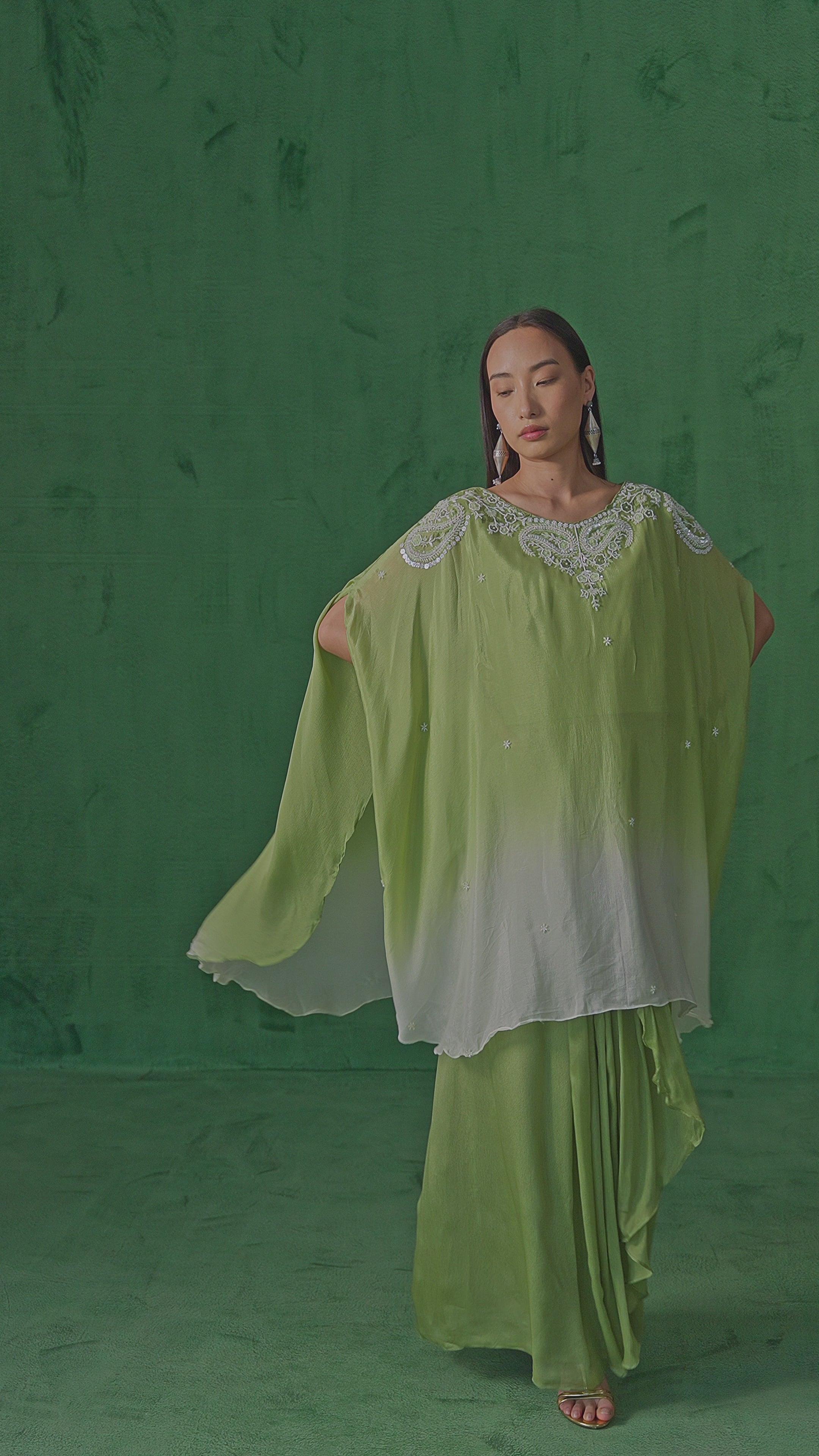 Ombre Green Embroidered Chinon Silk Kaftan Set
