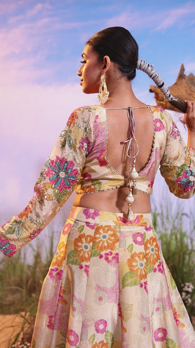 This charming two-piece ensemble is perfect for a festive daytime event, blending soft pastel hues with elaborate floral prints and shimmering handwork. It features a fitted Crop Top Blouse with a deep V-neck and long sleeves, paired with a voluminous Lehenga Skirt showcasing complementary printed and striped panels.