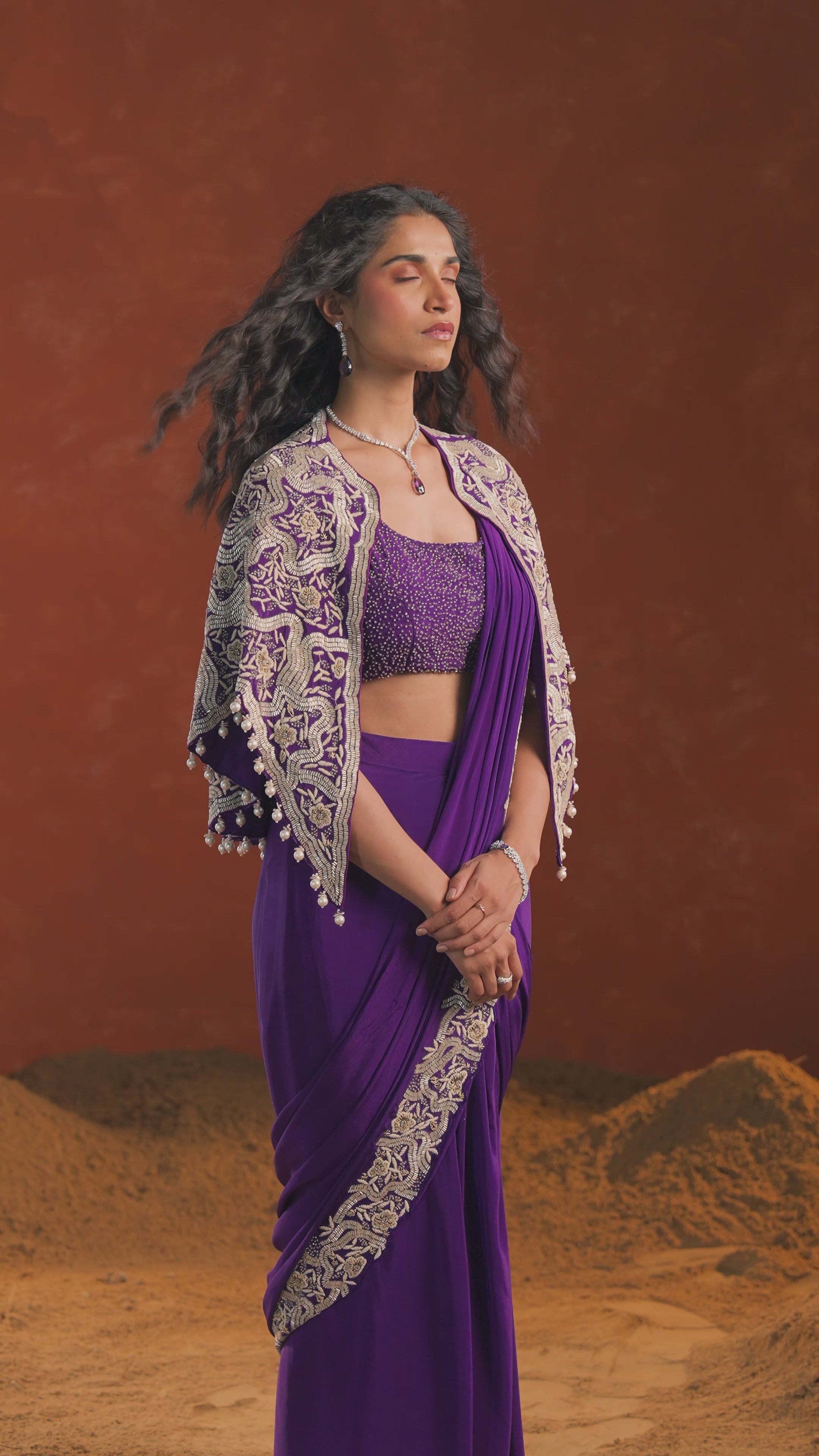 Royal purple chinon silk draped saree with cape, adorned with bead, sequin, cut dana, embroidery, and golden thread work.