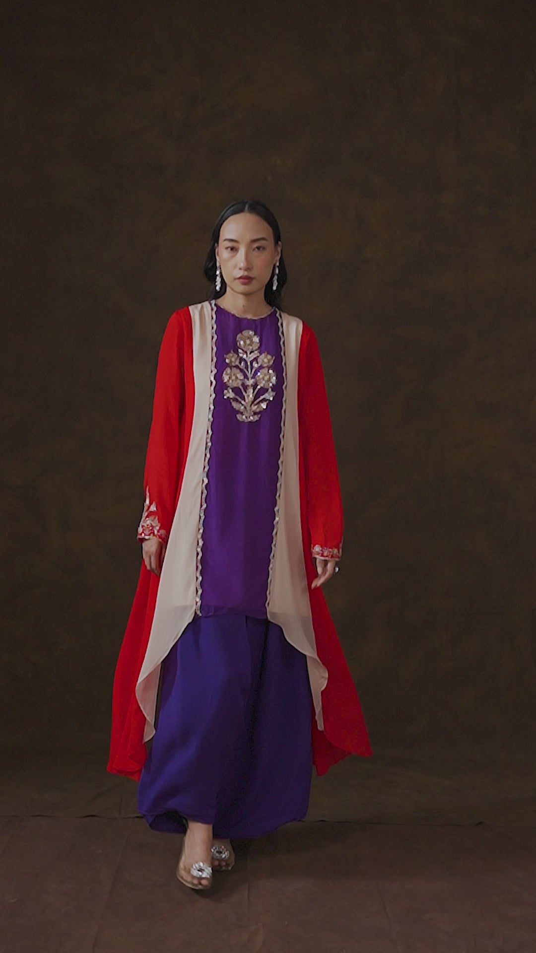 Make a bold and dramatic statement in this unique Multi-Colored Block Palazzo Set. This two-piece ensemble features a flowing chinon silk kurta, masterfully crafted with striking panels of Red, Deep Purple, and Ivory. The central panel and cuffs are exquisitely hand-embroidered with intricate floral motifs using sequins, zari, and beads. The kurta is paired with comfortable Deep Purple palazzo pants, creating a fluid and eye-catching silhouette.