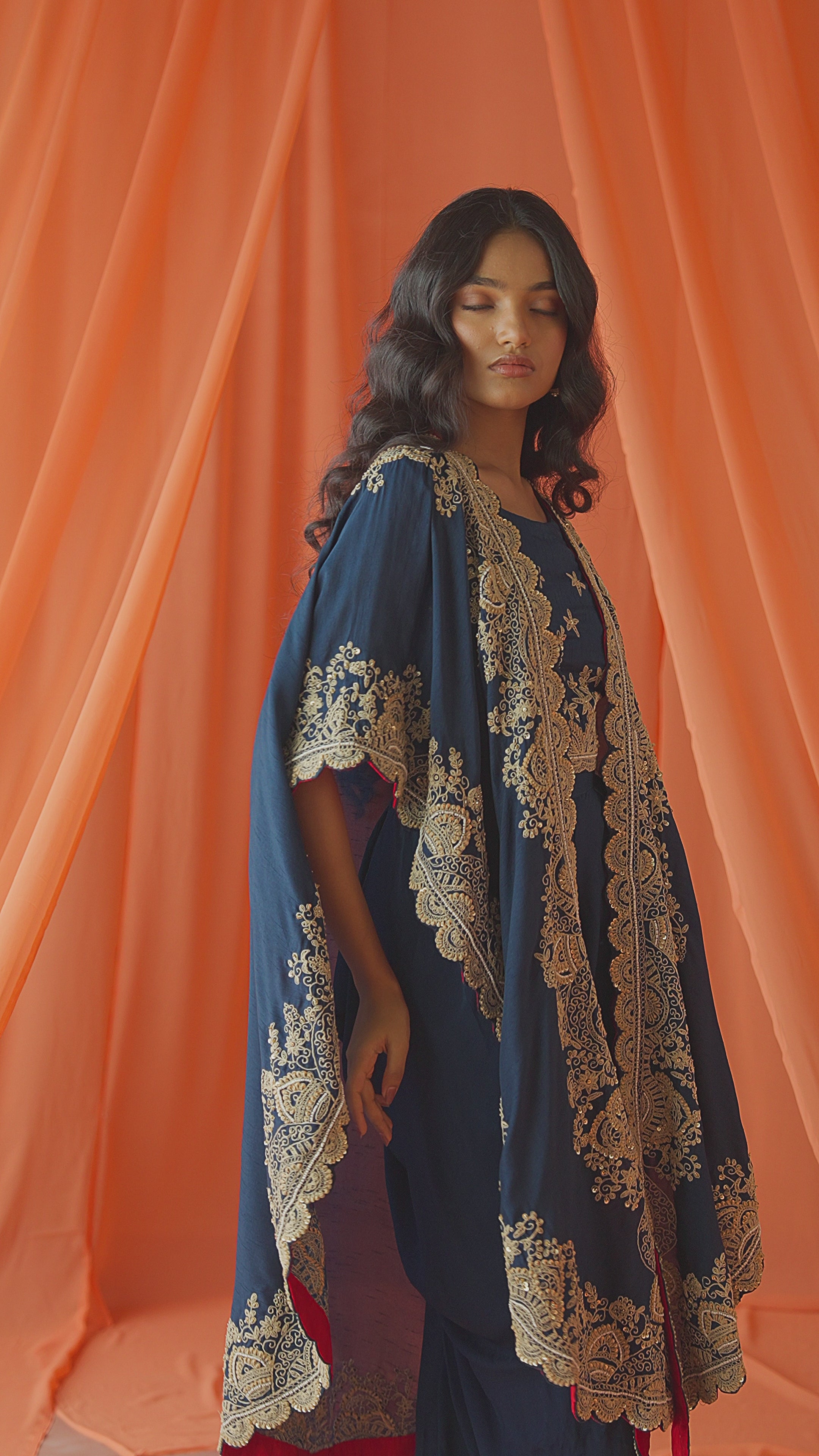 A vibrant blue raw silk set featuring a beautifully embroidered cape, paired with dhoti pants and a top. The delicate threadwork, beads, and sequins create an elegant and festive look.