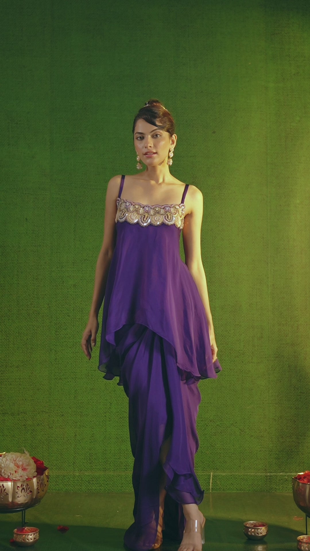Elevate your style with our Purple Embellished Organza Silk Skirt Set. The asymmetrical tunic, adorned with intricate sequin, cut dana, thread, and bead work, pairs beautifully with a matching solid draped skirt. Ideal for semi-formal events.