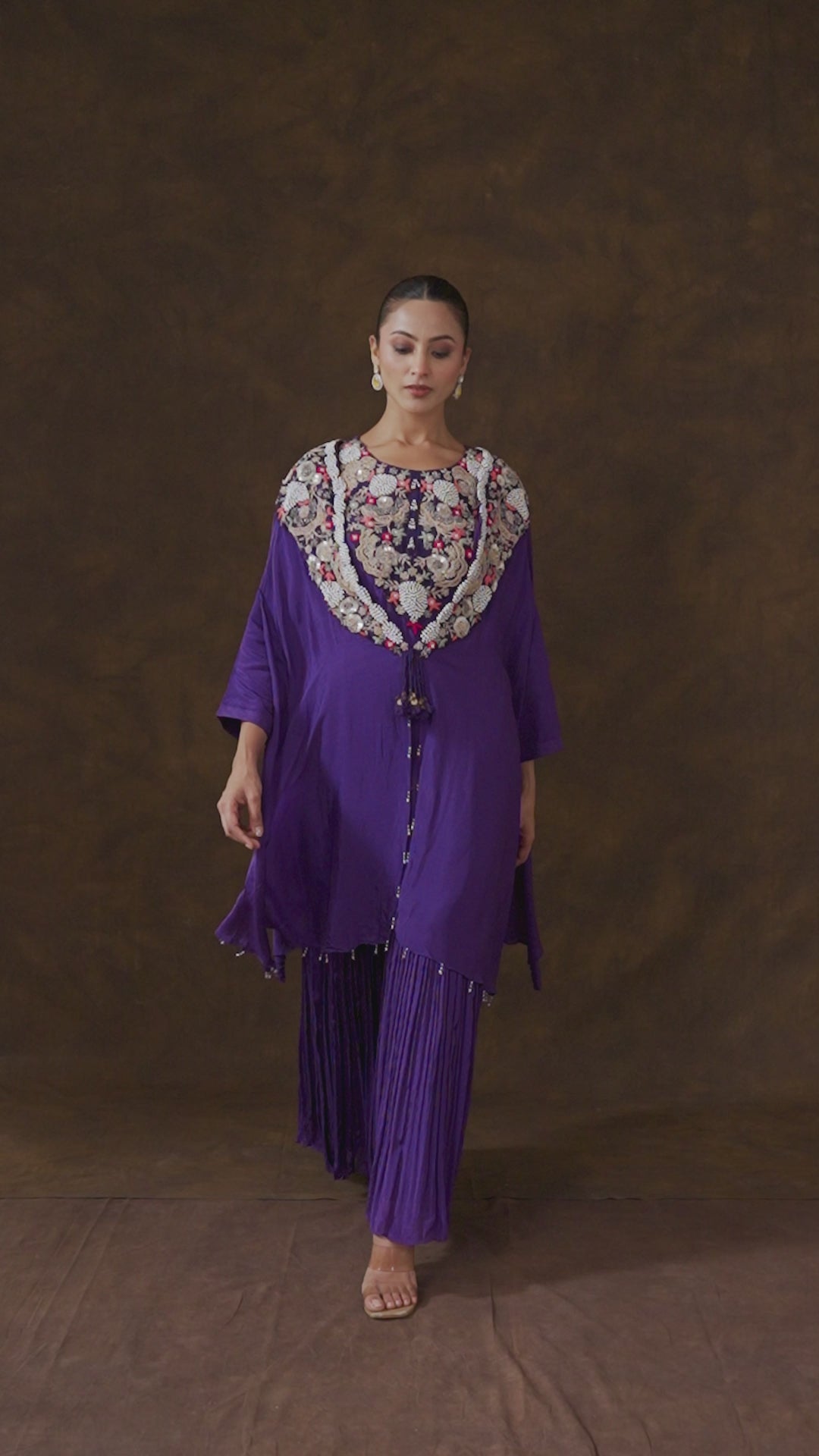 Exude unparalleled royalty in this magnificent Regal Violet Sharara Set. This three-piece ensemble, crafted from flowing chinon silk, features a heavily pleated sharara and a kurta, perfectly layered beneath a shrug. The shrug is a statement piece, featuring a spectacular, wide collar entirely covered in intricate handwork, including pearl, bead, coin, zari, and sequin embellishments.