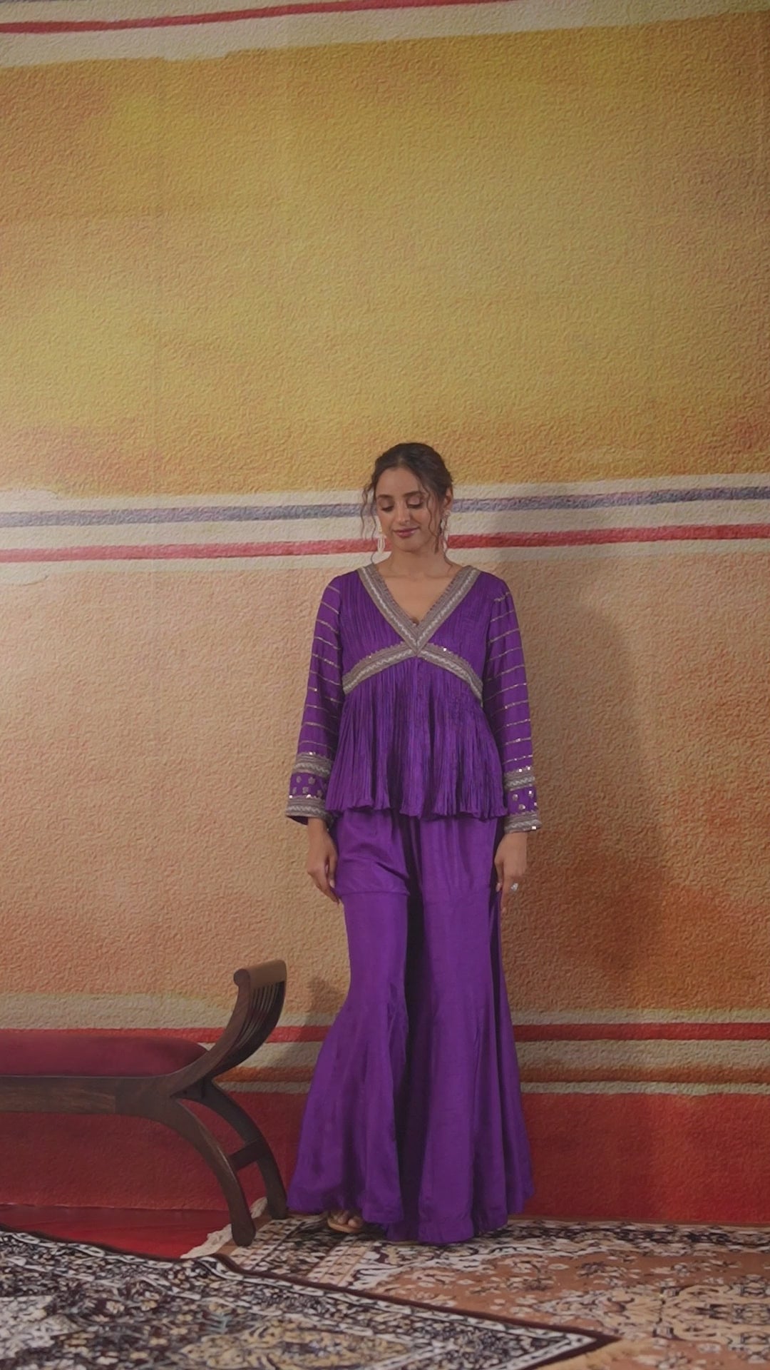 The Purple embellished raw silk short kurta set. Kurta is crafted with intricate sequin, Zari and aari work on its neck line and falling sleeves. It comes with matching raw silk solid sharara. This outfit is suitable for semi-formal occasions, making all the heads turn towards you.