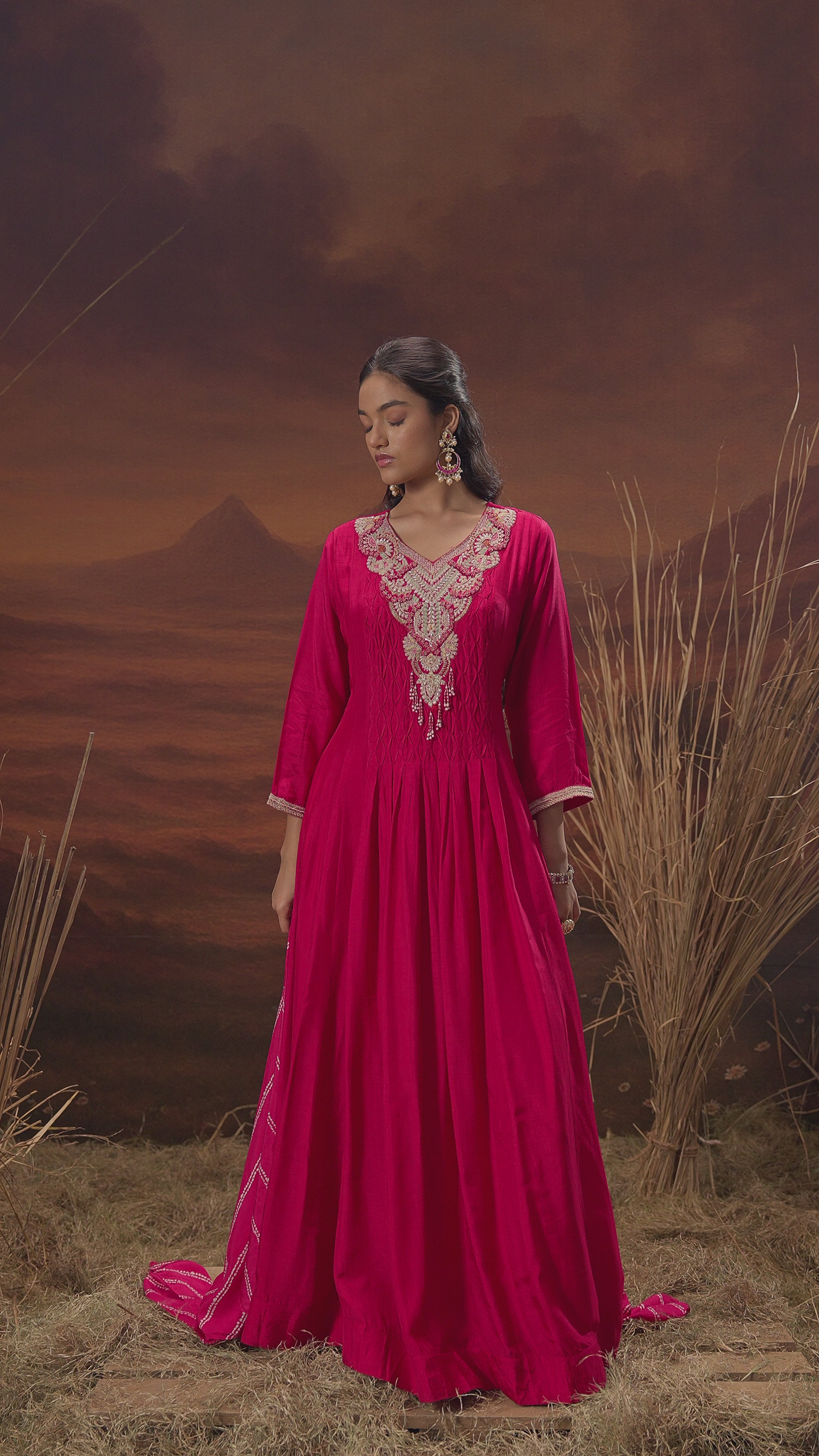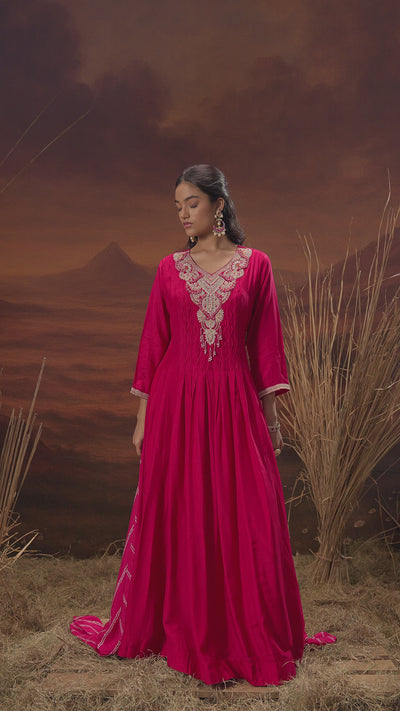 Command all attention in this magnificent Queen Pink Anarkali Set. This two-piece ensemble features a flowing, padded raw silk Anarkali kurta. The bodice is a focal point, exquisitely embellished with intricate zari, sequin, bead, and thread handwork, and finished with delicate tassels. The look is completed with a matching dupatta featuring a vibrant print, adding a beautiful, traditional touch.