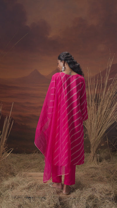 Fuchsia Pink Embellished Raw Silk Pant Set