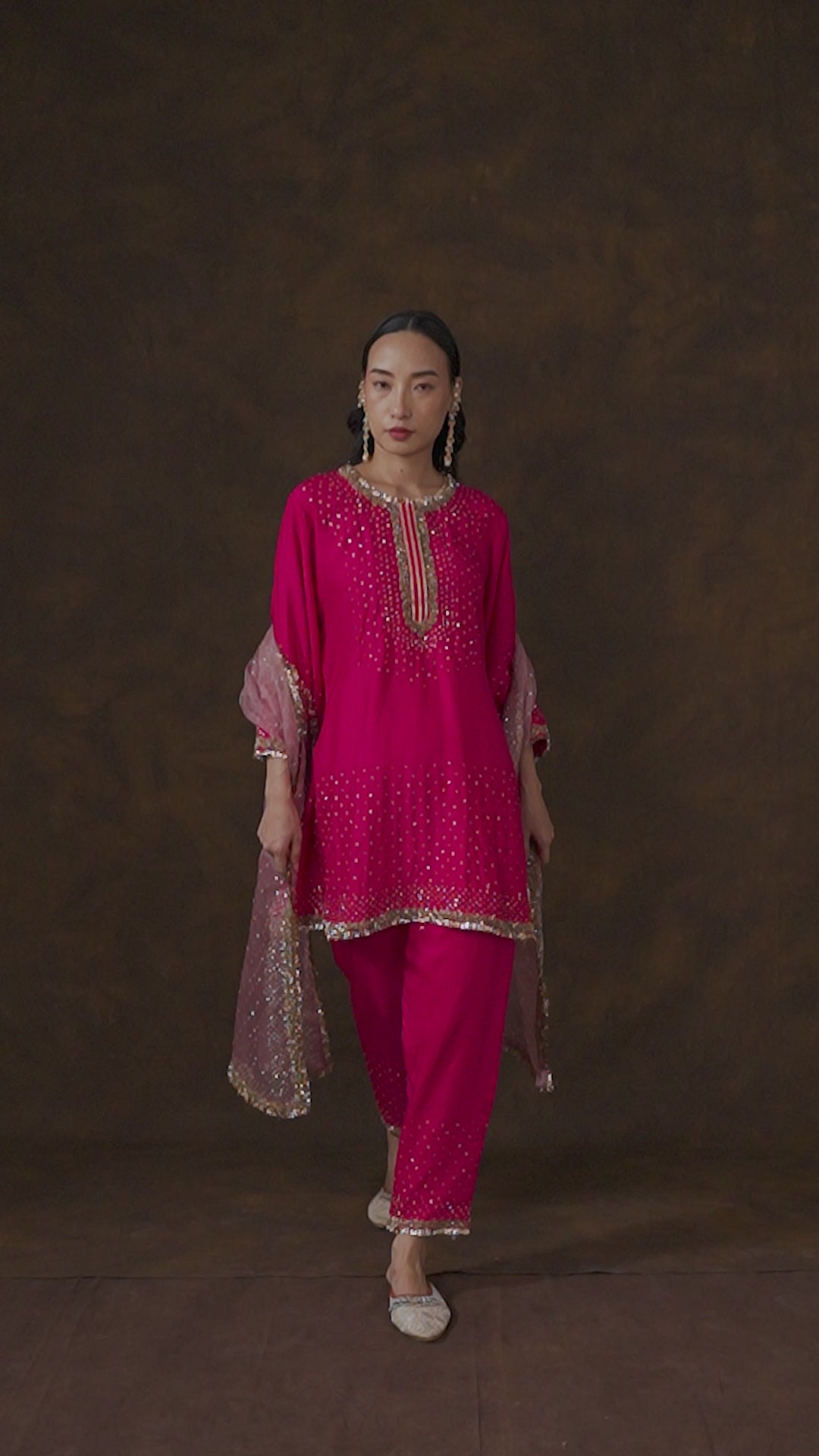 Shine brightly in this stunning Queen Pink and Black Pant Set. This three-piece ensemble features a short raw silk kurta and pant, both adorned with delicate, all-over sequin work. The set is elegantly contrasted by a sheer organza silk dupatta, which is heavily embellished with sequins and finished with a shimmering Kiran border.