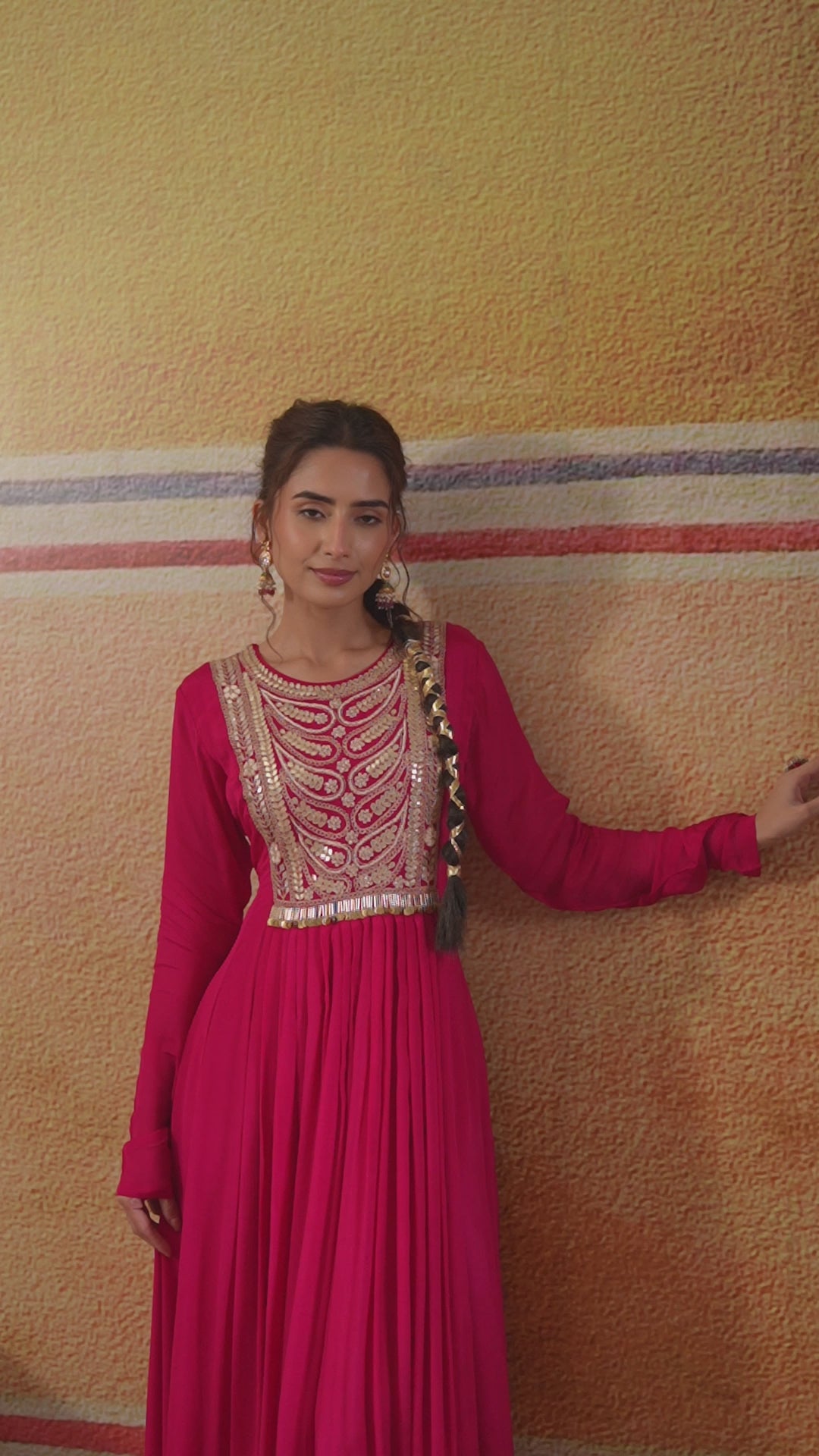 Embrace elegance with our Rani Pink Chinon Silk Gown, featuring intricate zari, bead, and aari taari handwork. Styled with frills, it’s perfect for semi-formal events.