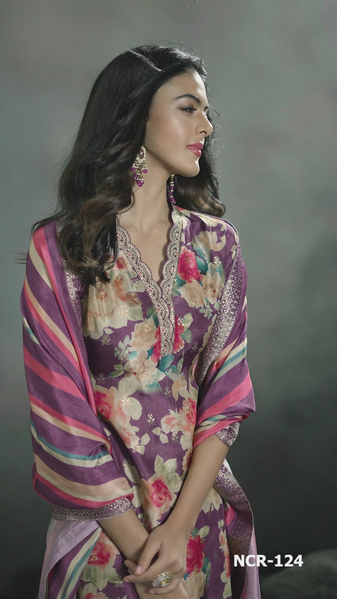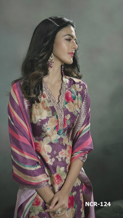 This elegant three-piece suit is a beautiful mauve-purple printed ensemble. It is richly embellished with sparkling sequins and intricate golden thread work, perfect for any festive or special occasion.