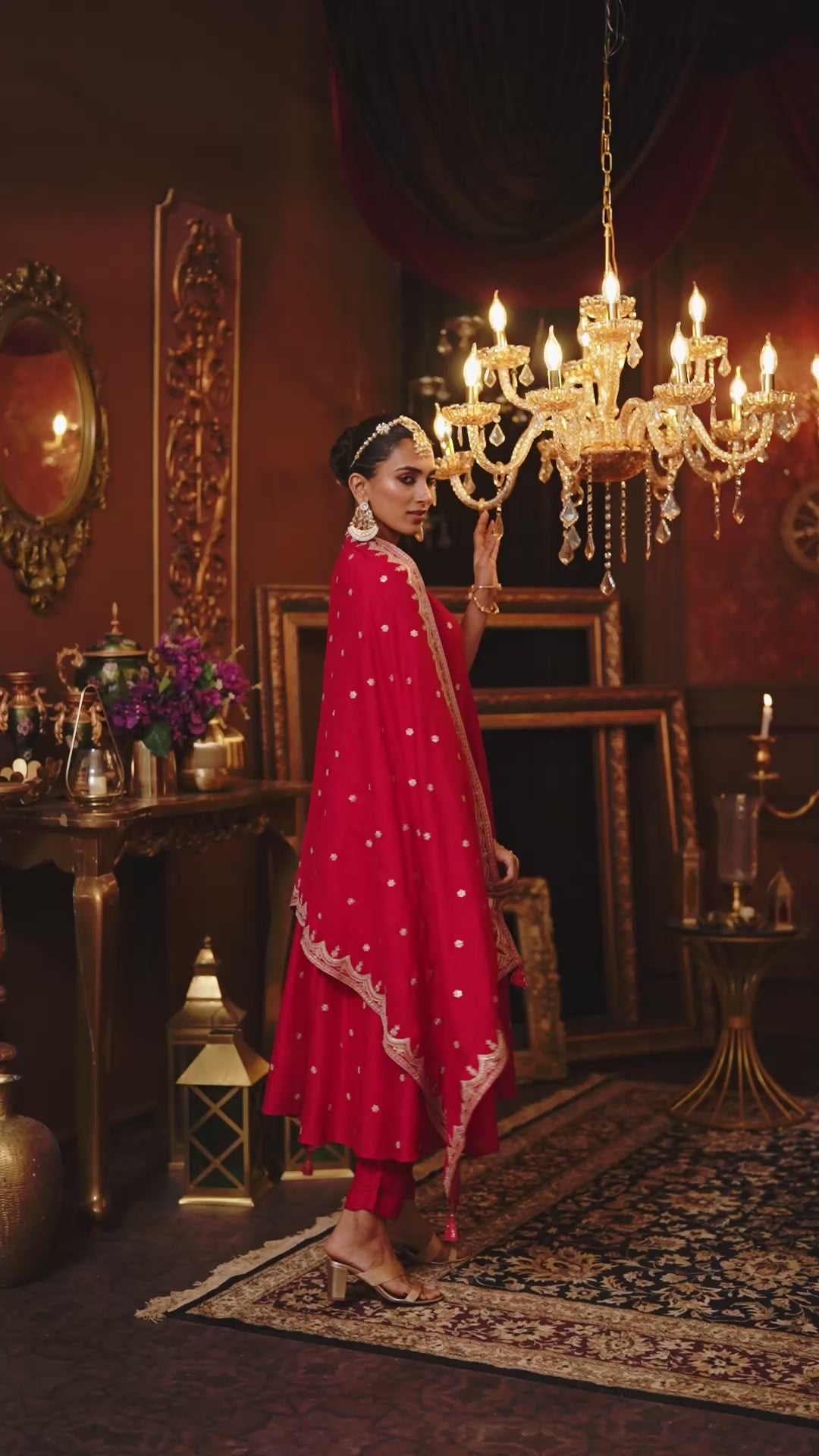 A captivating three-piece set crafted from luxurious Premium Silk, featuring a beautifully flared, frock-style kurta. The soothing kurta is adorned with delicate scatter motifs and intricate golden hand-embroidery on the yoke, pant, and dupatta borders for an opulent finish.
