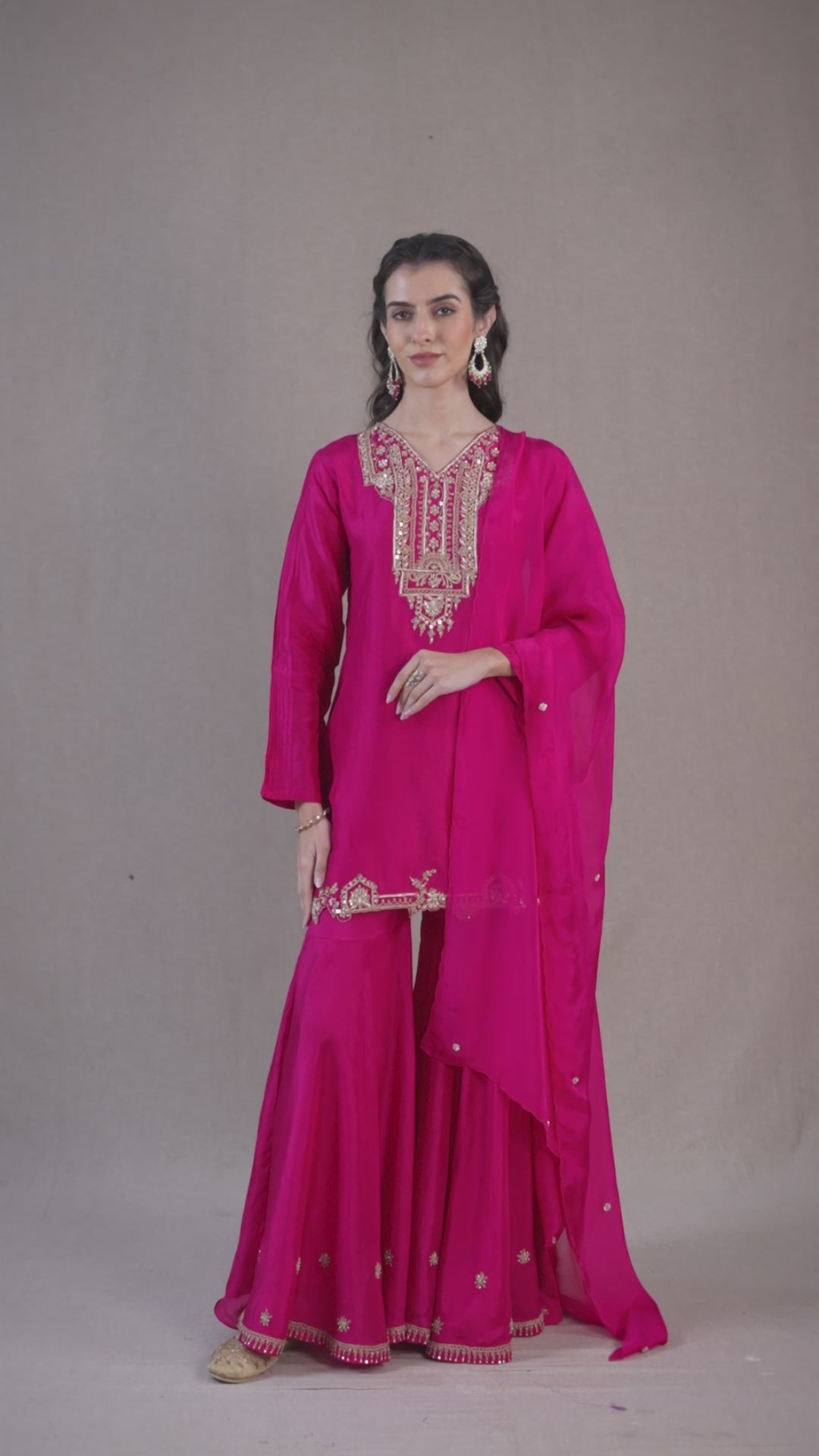 Introducing the Rani Pink Embroidered Raw Silk Sharara Set. The kurta features intricate sequin, zari, and aari handwork, paired with a matching sharara and an organza silk dupatta. Perfect for semi-formal wear.