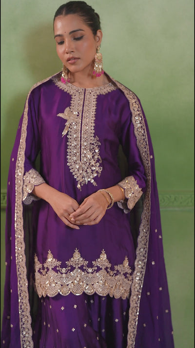 Plum Purple Embellished Satin Silk Sharara Set