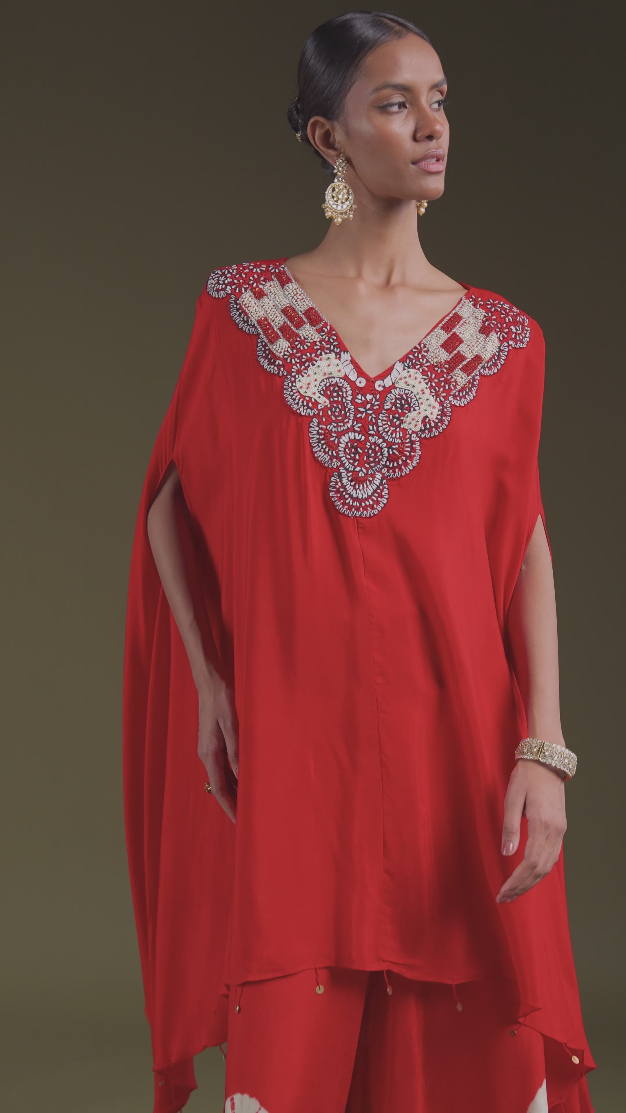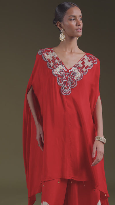 Turn every head in the room with this Red Embellished Premium Silk Kaftan Set—where fluid elegance meets artisanal brilliance in a celebration of color and craft.
