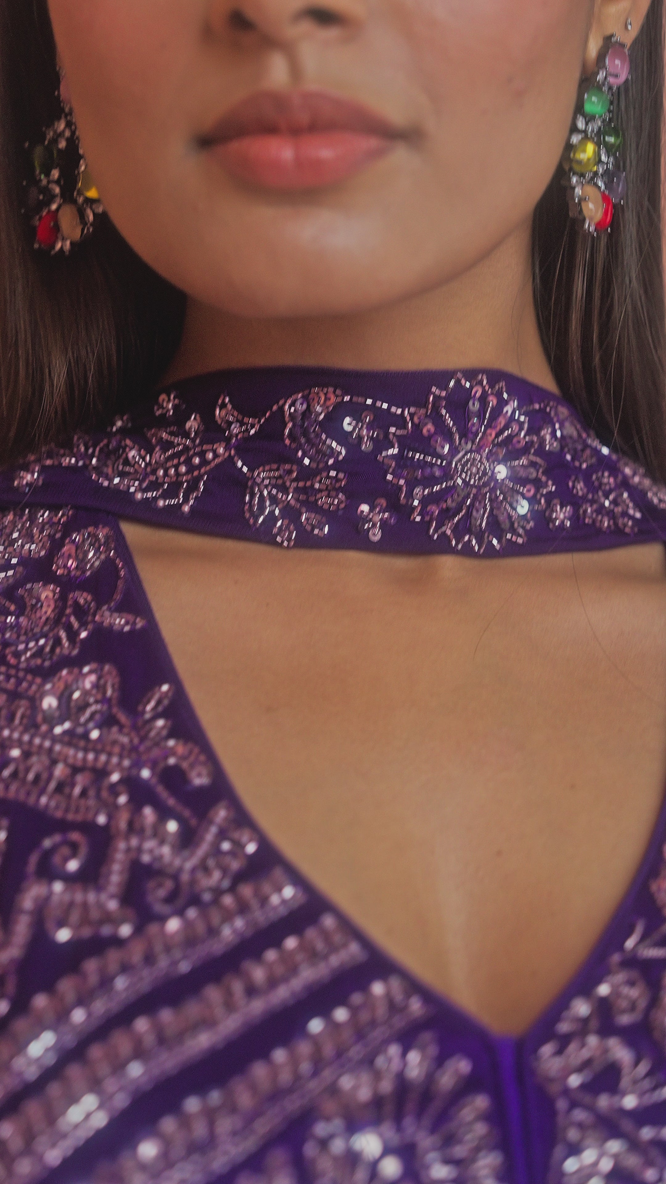 Elevate your festive wardrobe with this exquisite Dark Purple Embellished Organza Silk Skirt Set, a perfect blend of traditional elegance and contemporary charm. The ensemble features a meticulously crafted blouse adorned with intricate hand embroidery, showcasing shimmering thread and sequin work that adds a touch of regal sophistication.