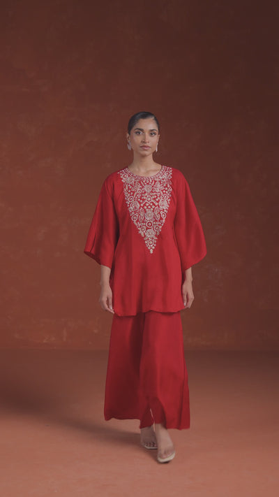 Turn heads at every festive occasion with this stunning Red Kaftan Set, exquisitely crafted for elegance and grace.