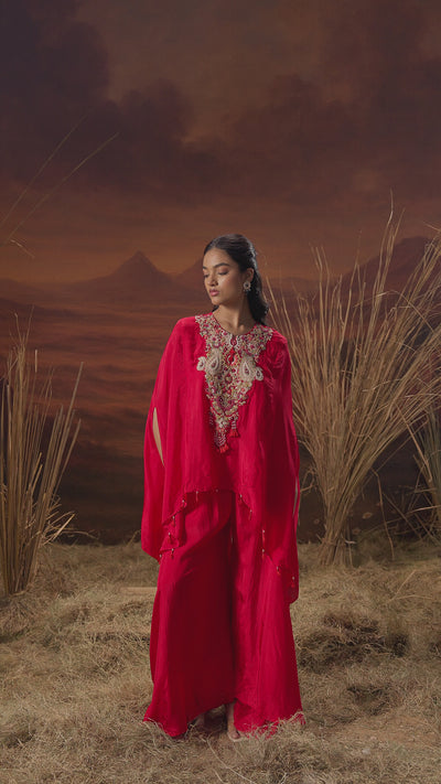 Shine bright in this gorgeous Poppy Red Kaftan and Palazzo Set. This three-piece ensemble features a flowing kaftan and palazzo pants crafted from smooth satin silk, complete with a padded inner. The kaftan's yoke is the focal point, adorned with intricate handwork, sequins, and beads in a beautiful multi-colored design, and finished with delicate tassels.