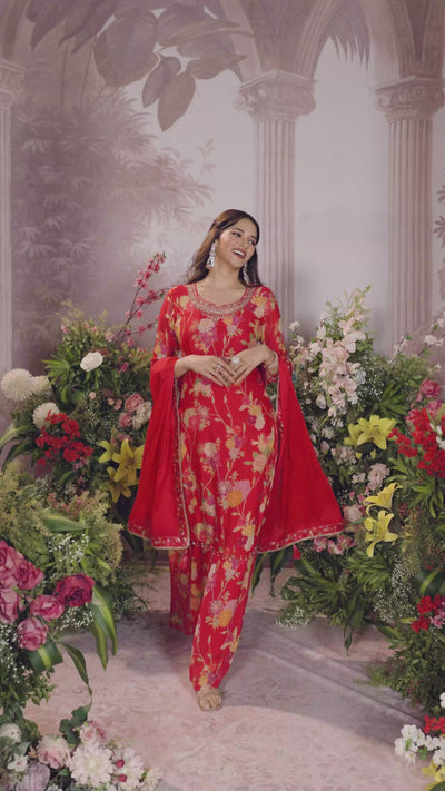 Step into elegance with the Red Floral Premium Silk Palazzo Set. This playful ensemble features a vibrant kurta adorned with shimmering sequin and golden aari thread handwork over a lively floral print. Paired with flowing palazzos and a matching dupatta, it’s perfect for celebrations where you want to twirl, sparkle, and stand out effortlessly.