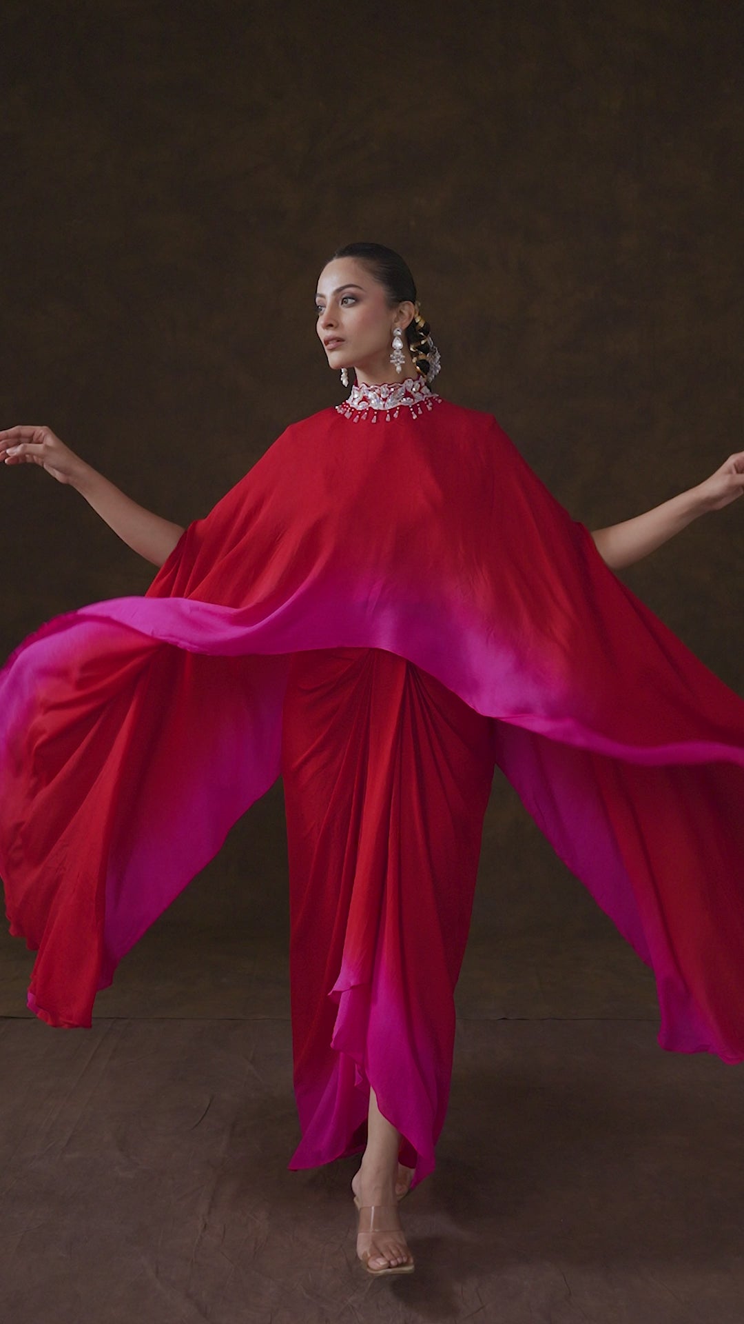 Make a show-stopping entrance in this vibrant Red & Fuchsia Ombré Set. This two-piece ensemble is crafted from flowing georgette silk, featuring a dramatic ombré effect. The asymmetrical draped skirt is perfectly complemented by a cape top with a stunning, high-neck collar exquisitely embellished with intricate handwork, sequins, beads, and stone tassels, creating a statement jeweled neckline.