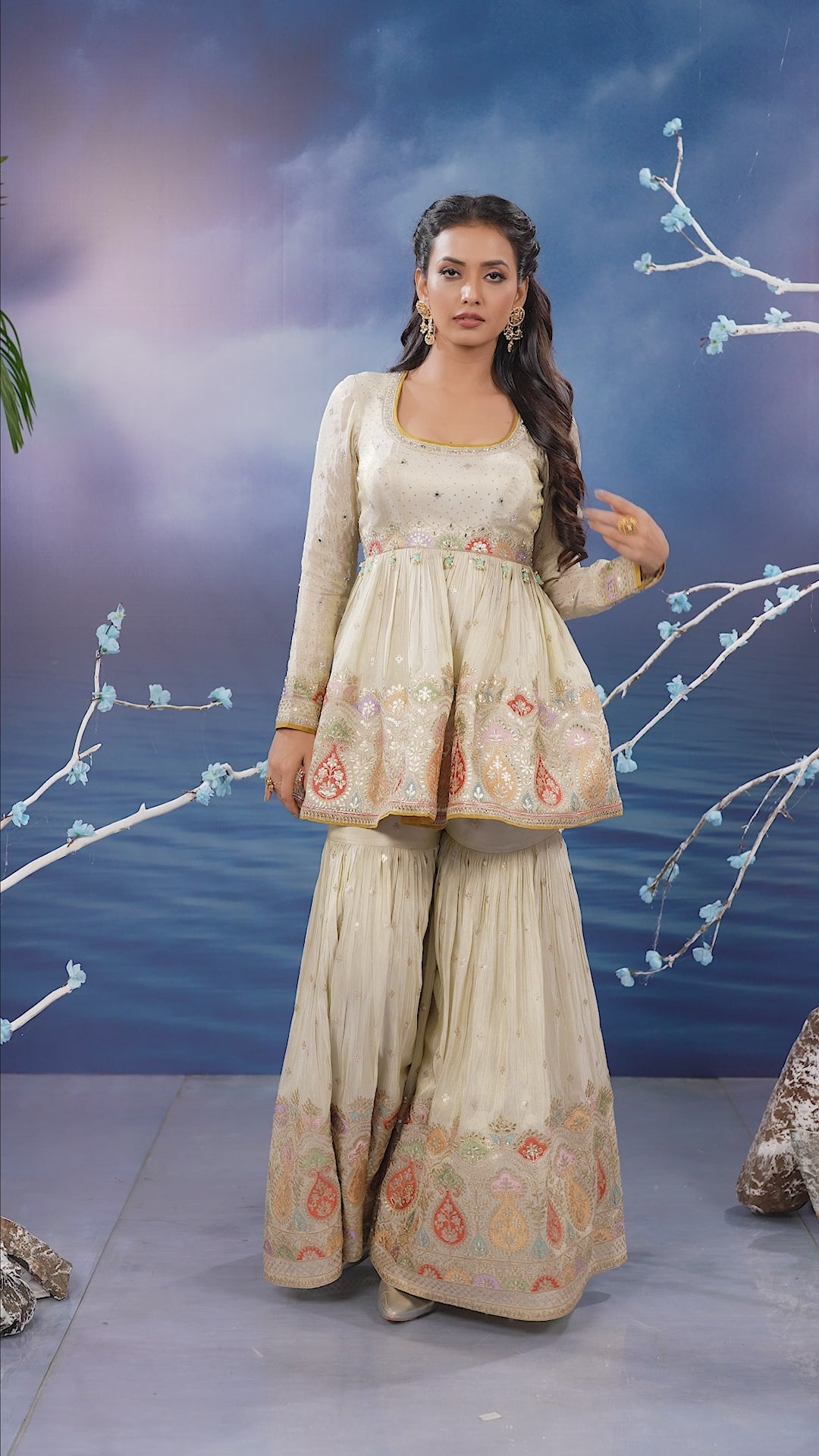Elevate your festive wardrobe with our Champagne Gold Embellished Habutai Silk Sharara Set. This exquisite ensemble features a padded peplum tunic which is adorned with intricate sequins, bead, mirror and gottapatti showcasing exceptional craftsmanship. Paired with matching embellished flared sharara pants. This set is perfect for semi-formal occasions.