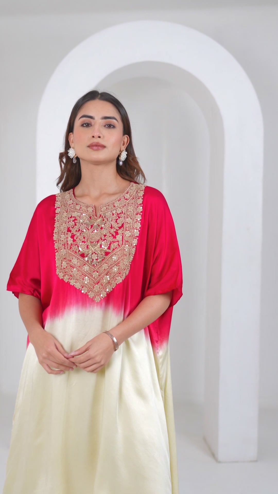Introducing the Red Ombre-Dyed Satin Silk Kaftan Set. Featuring intricate sequin, aari, and zari handwork, the kaftan is paired with matching light beige raw silk palazzo styled with fringes at the bottom. Perfect for semi-formal wear.