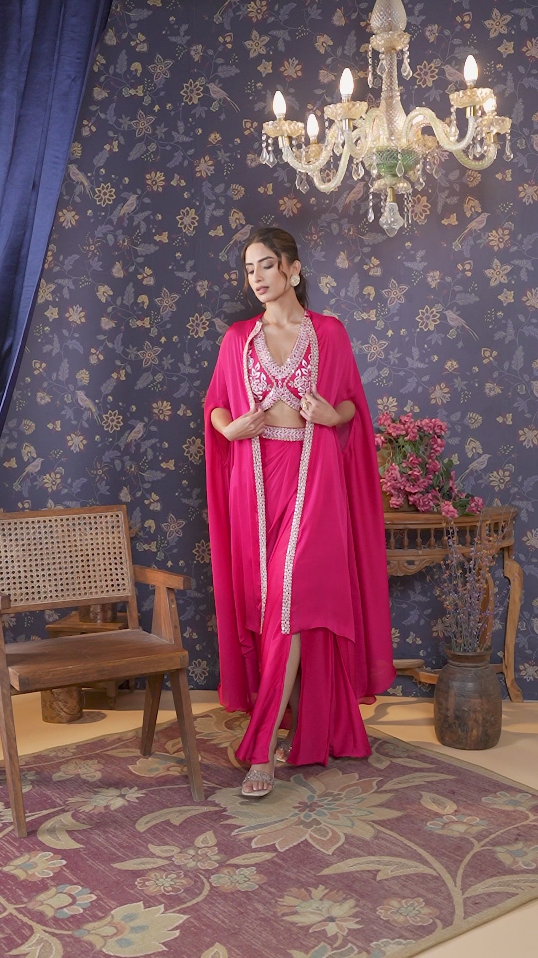 Reddish pink embroidered premium silk padded crop top. Crafted with thread, mirror and aari taari hand work. Comes with pleated draped skirt, Styled with a front slit. Embellished at the waist line. Also paired with matching cape. Apt for semi formal wear.