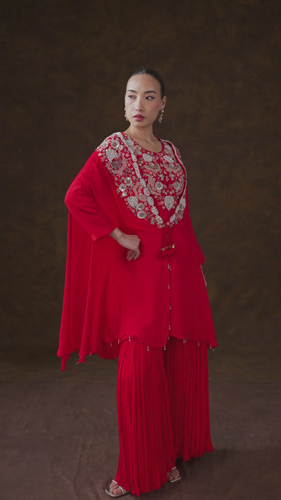 Exude unparalleled royalty in this magnificent Rich Red Sharara Set. This three-piece ensemble, crafted from flowing chinon silk, features a heavily pleated sharara and a kurta, perfectly layered beneath a shrug. The shrug is a statement piece, featuring a spectacular, wide collar entirely covered in intricate handwork, including pearl, bead, coin, zari, and sequin embellishments.