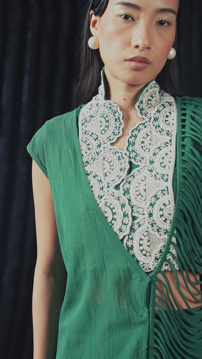 The rich green ensemble is beautifully detailed with elegant white and silver embellishments. The intricate beads, sequins, and thread work on the neckline and the unique, draped shrug create a contemporary and luxurious look.