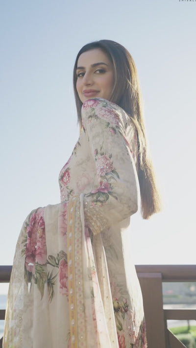 A stunning three-piece suit featuring a floral printed kurta and voluminous sharara crafted from soft crepe silk fabric. The matching printed dupatta completes this graceful, ready-to-wear outfit.