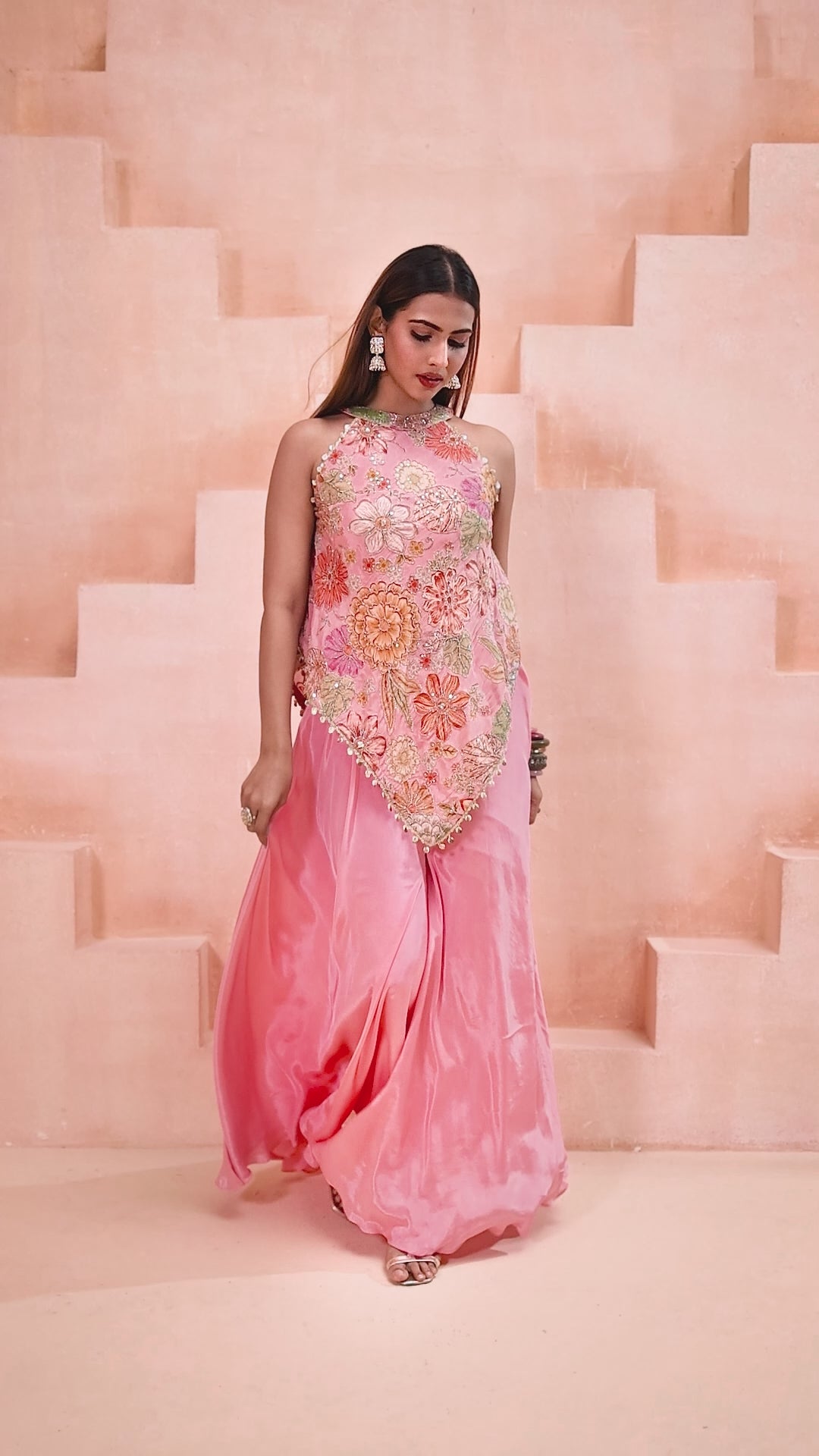 This contemporary ensemble features a halter-neck asymmetric tunic heavily embellished with floral metallic thread embroidery. Paired with voluminous flared palazzo pants, it offers a high-fashion, shimmering silhouette perfect for modern festive celebrations.